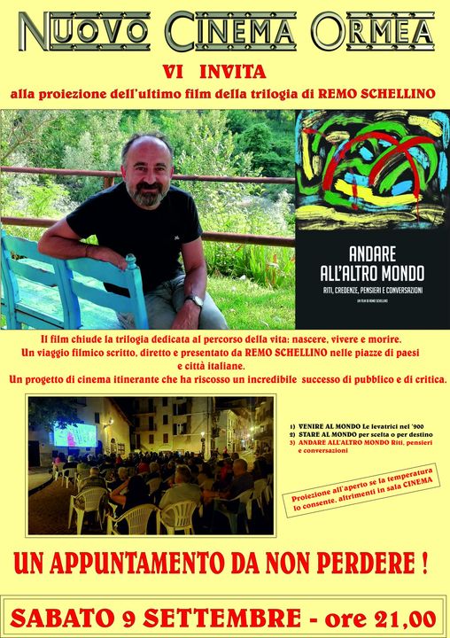 Alle ore 21.00 il Nuovo Cinema Ormea ha il piacere di ospitare REMO SCHELLINO con il suo ultimo lavoro cinematografico: ANDARE ALL'ALTRO MONDO in prima visione di zona. Un docufilm che esplora miti, credenze, considerazioni e testimonianze che chiude la trilogia di film dedicati alla vita.