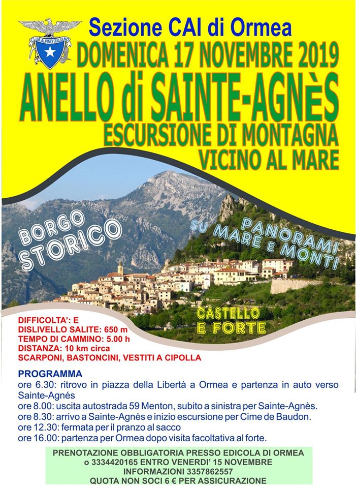ore 8.30: arrivo a Sainte-Agnès e inizio escursione per Cime de Baudon.