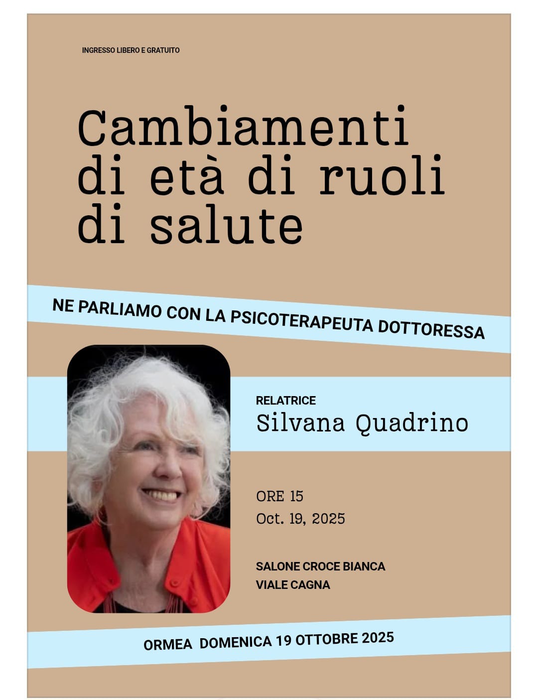 L’appuntamento sarà guidato dalla dottoressa Silvana Quadrino, psicoterapeuta di grande esperienza, che accompagnerà i partecipanti in una riflessione sui cambiamenti che ognuno di noi affronta nelle diverse fasi della vita: l’età che avanza, i mutamenti nei ruoli familiari e sociali, la gestione della salute e delle nuove esigenze che essa comporta.