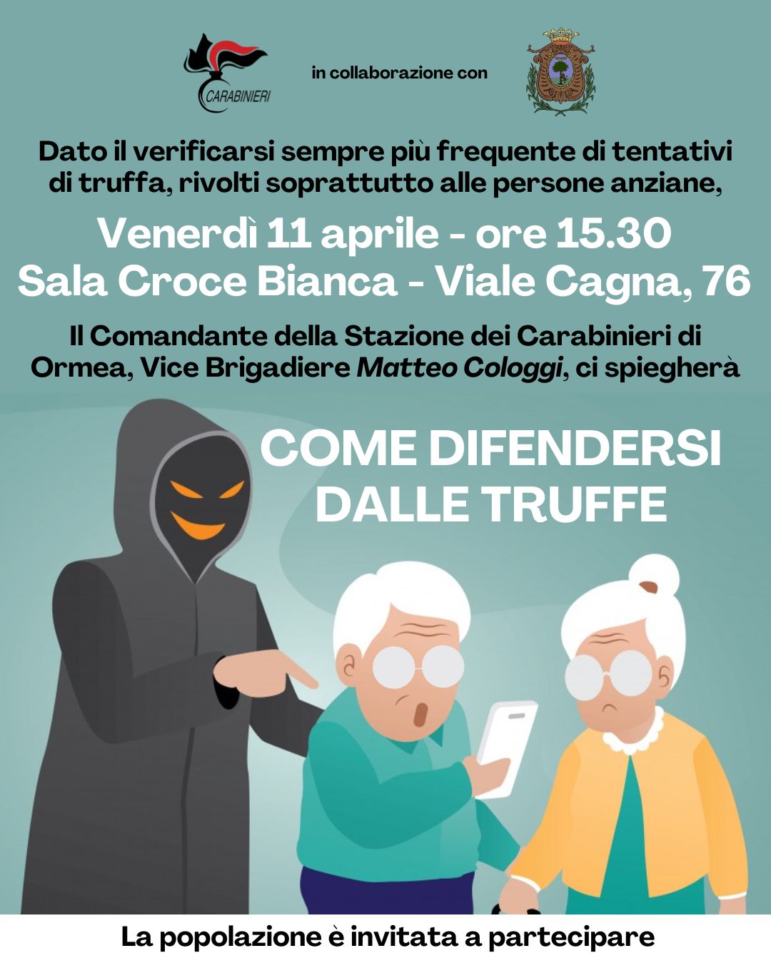Negli ultimi tempi si è registrato un aumento dei tentativi di truffa, in particolare ai danni delle persone anziane. Per contrastare questo fenomeno e informare la cittadinanza sui metodi più efficaci per proteggersi, il Vice Brigadiere Matteo Cologgi, Comandante della Stazione dei Carabinieri di Ormea, terrà un incontro informativo.