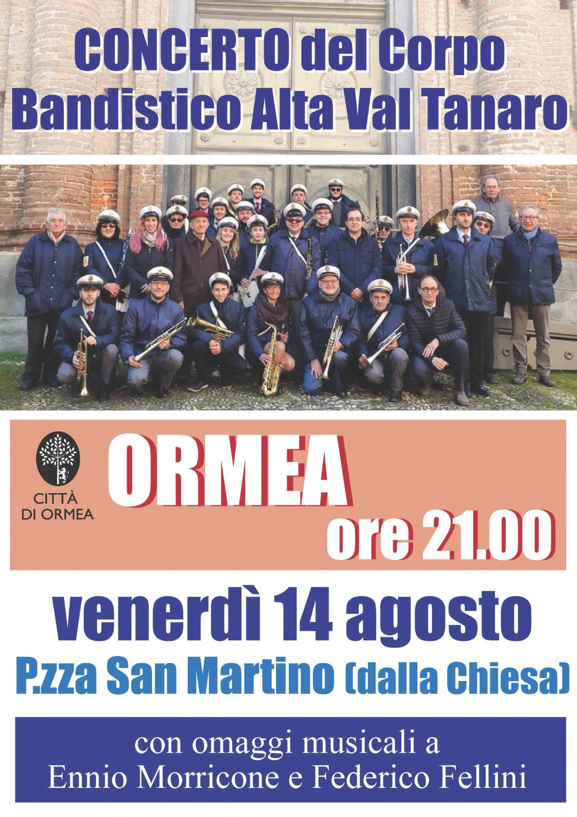 In Piazza San Martino alle ore 21.00 Concerto del Corpo Bandistico Alta Val Tanaro, con omaggi musicali a Ennio Morricone e Federico Fellini.