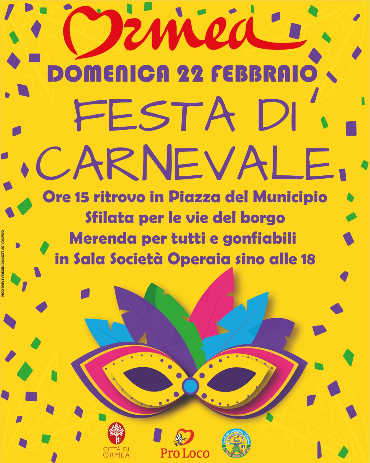Domenica 22 febbraio la Festa di Carnevale arriva anche nel nostro piccolo paese, e noi siamo felici di invitarvi a una giornata di allegria, musica e colori.