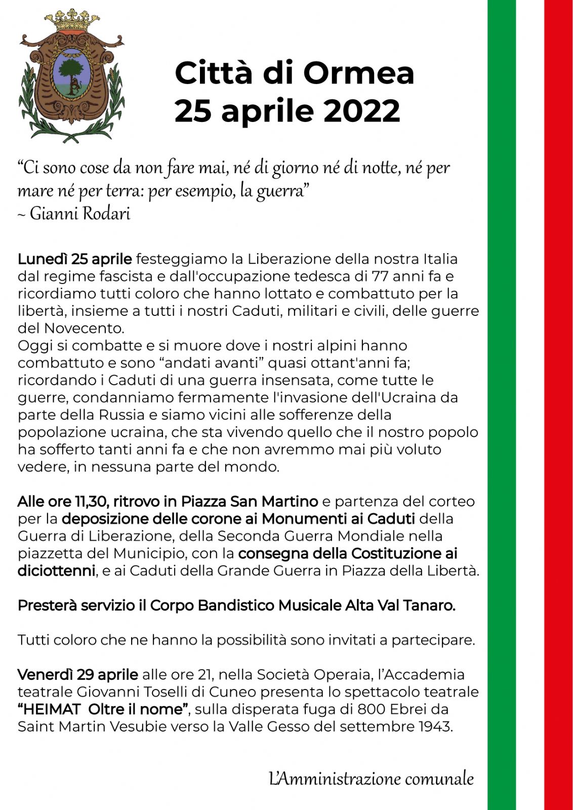 Lunedì 25 aprile festeggiamo la Liberazione della nostra Italia dal regime fascista e dall'occupazione tedesca di 77 anni fa e ricordiamo tutti coloro che hanno lottato e combattuto per la libertà, insieme a tutti i nostri Caduti, militari e civili, delle guerre del Novecento.