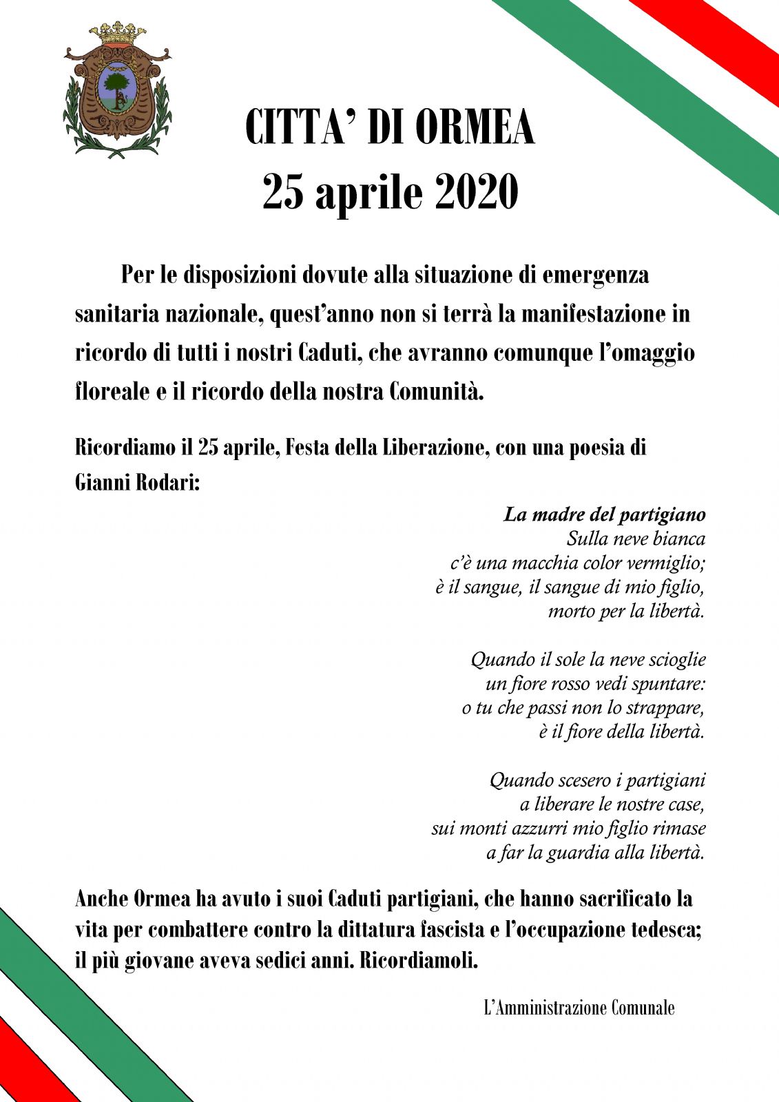 Per le disposizioni dovute alla situazione di emergenza sanitaria nazionale, quest’anno non si terrà la manifestazione in ricordo di tutti i nostri Caduti, che avranno comunque l’omaggio floreale e il ricordo della nostra Comunità.