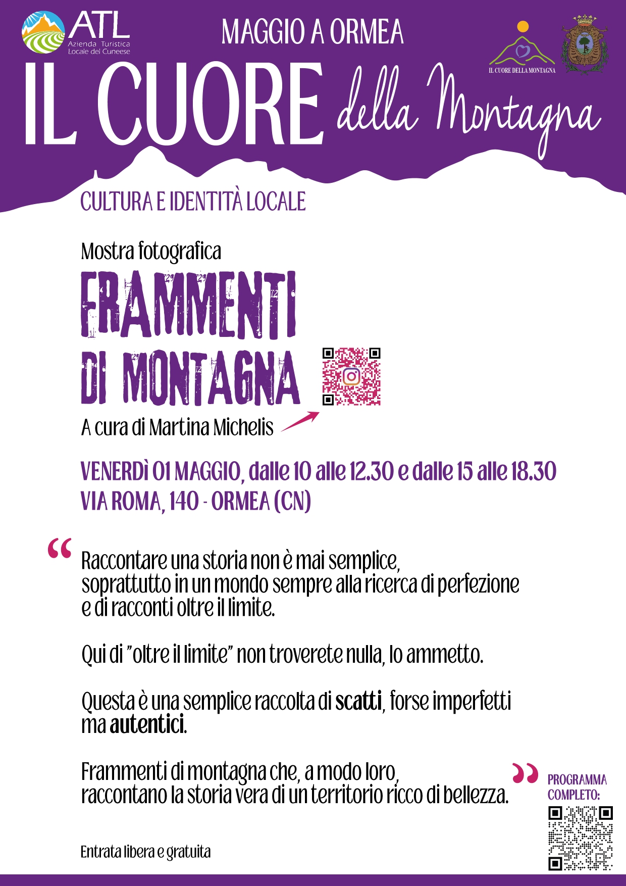 In occasione de 'Il Cuore della Montagna', venerdì 01 maggio, in Via Roma 140, sarà possibile visitare la mostra fotografica 'Frammenti di Montagna', a cura di Martina Michelis.