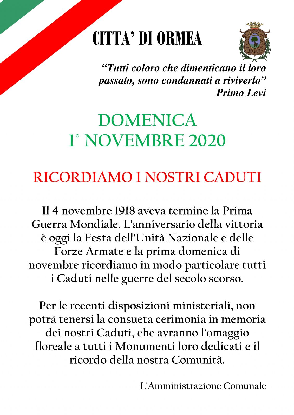 Per le recenti disposizioni ministeriali, non potrà tenersi la consueta cerimonia in memoria dei nostri Caduti, che avranno l'omaggio floreale a tutti i Monumenti loro dedicati e il ricordo della nostra Comunità.