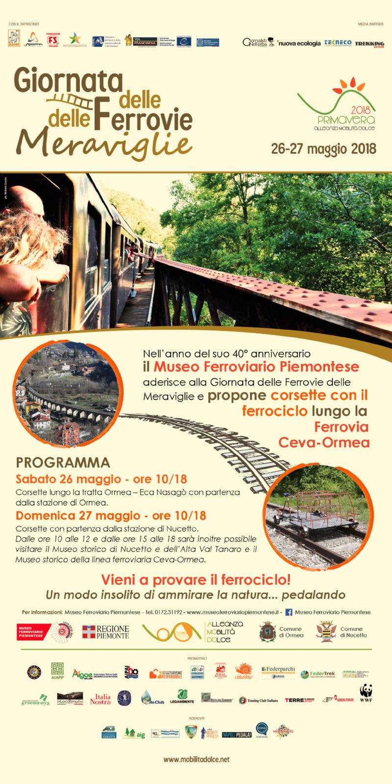 Nell'anno del suo 40° anniversario il Museo Ferroviario Piemontese aderisce alla Giornata delle Ferrovie delle Meraviglie e propone corsette con il ferrociclo lungo la ferrovia Ceva-Ormea.