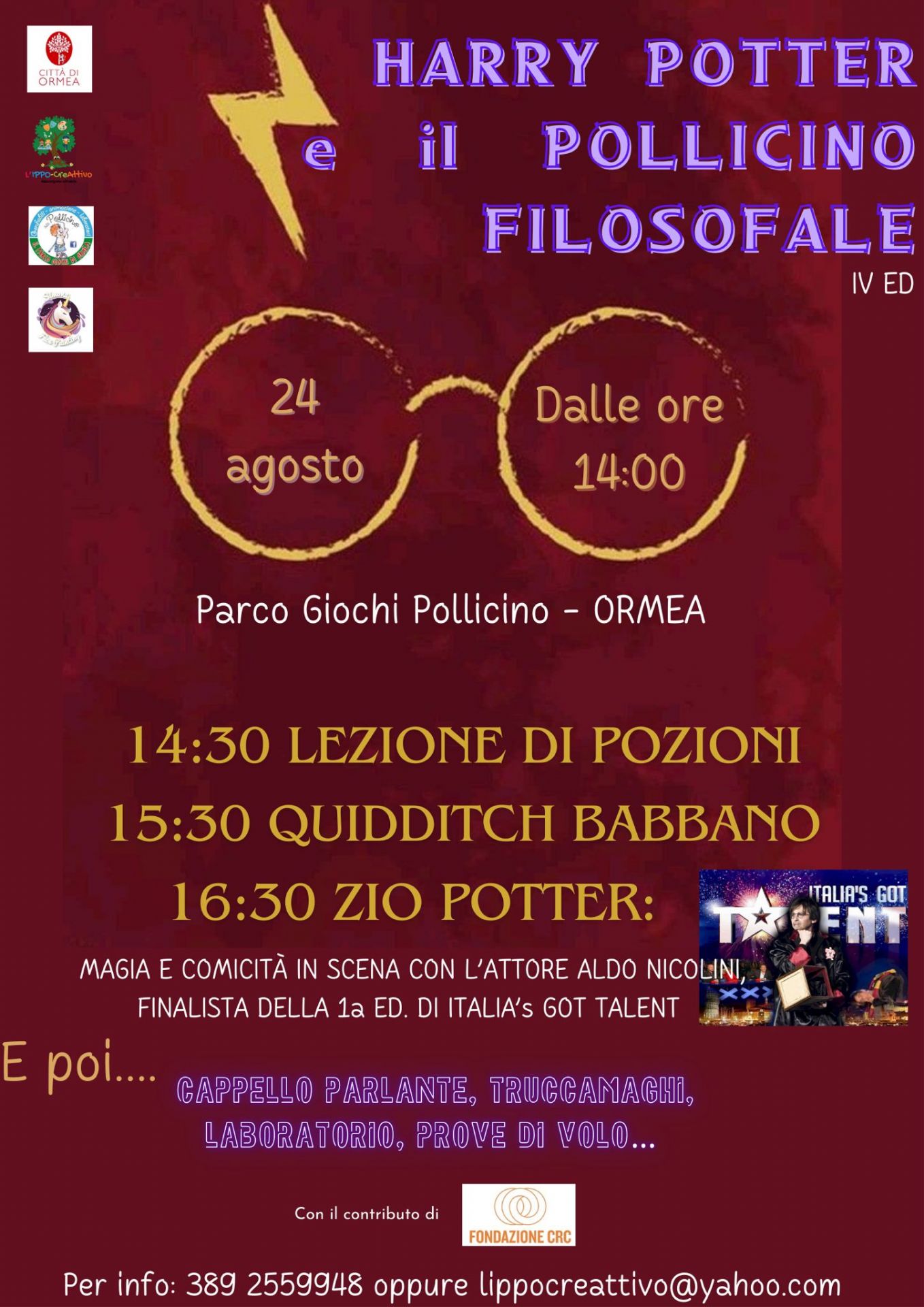 Si comincerà con il laboratorio di pozioni alle 14:30, a seguire il Quidditch Babbano e a alle 16:30 Zio Potter: magia e comicità con l’attore Aldo Nicolini, finalista della prima edizione di “Italia’s Got Talent”. Nell’arco del pomeriggio i bambini potranno provare il cappello parlante, cimentarsi in un laboratorio creativo, nella lezione di volo e farsi truccare da Simona De Bernardi.
