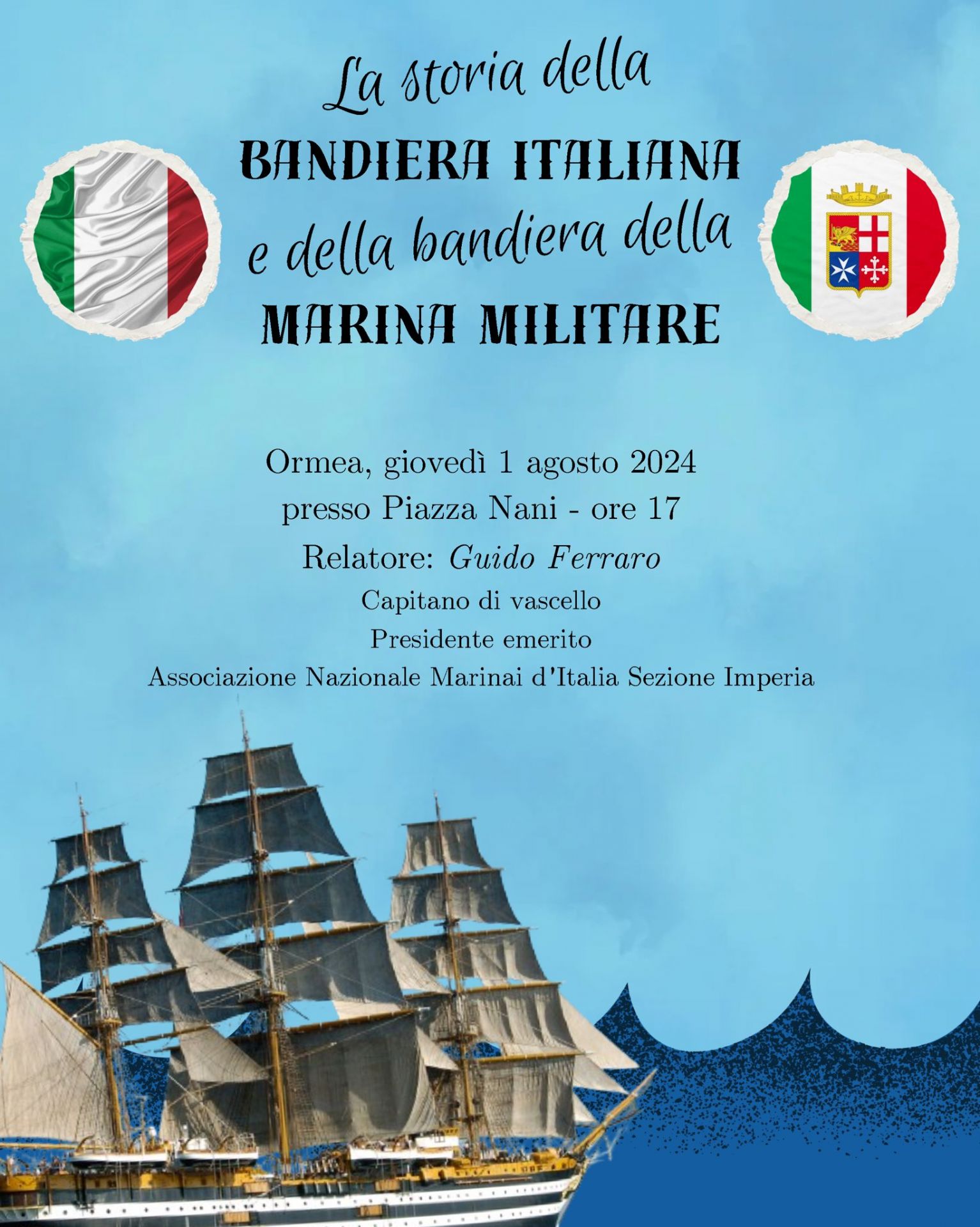 Alle ore 17.00 in piazza Nani, vi attende Guido Ferraro, Capitano di vascello e Presidente emerito dell'Associazione Nazionale Marinai d'Italia - sezione di Imperia
