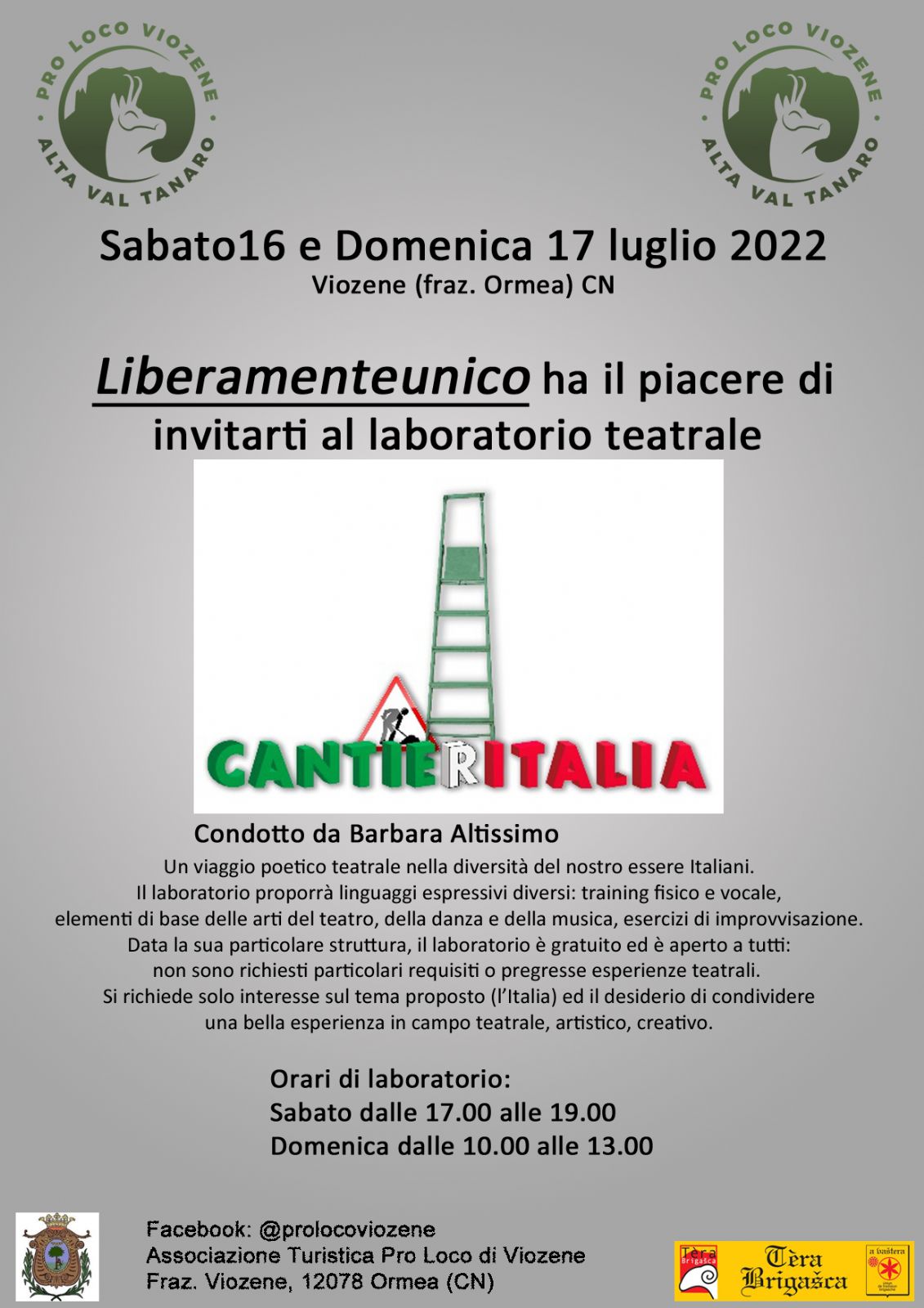 Il laboratorio proporrà linguaggi espressivi diversi: training fisico e vocale, elementi di base delle arti del teatro, della danza e della musica, esercizi di improvvisazione. Data la sua particolare struttura, il laboratorio è gratuito ed è aperto a tutti: non sono richiesti particolari requisiti o pregresse esperienze teatrali. Si richiede solo interesse sul tema proposto: (l'Italia) e il desiderio di condividere una bella esperienza in campo teatrale, artistico e creativo.