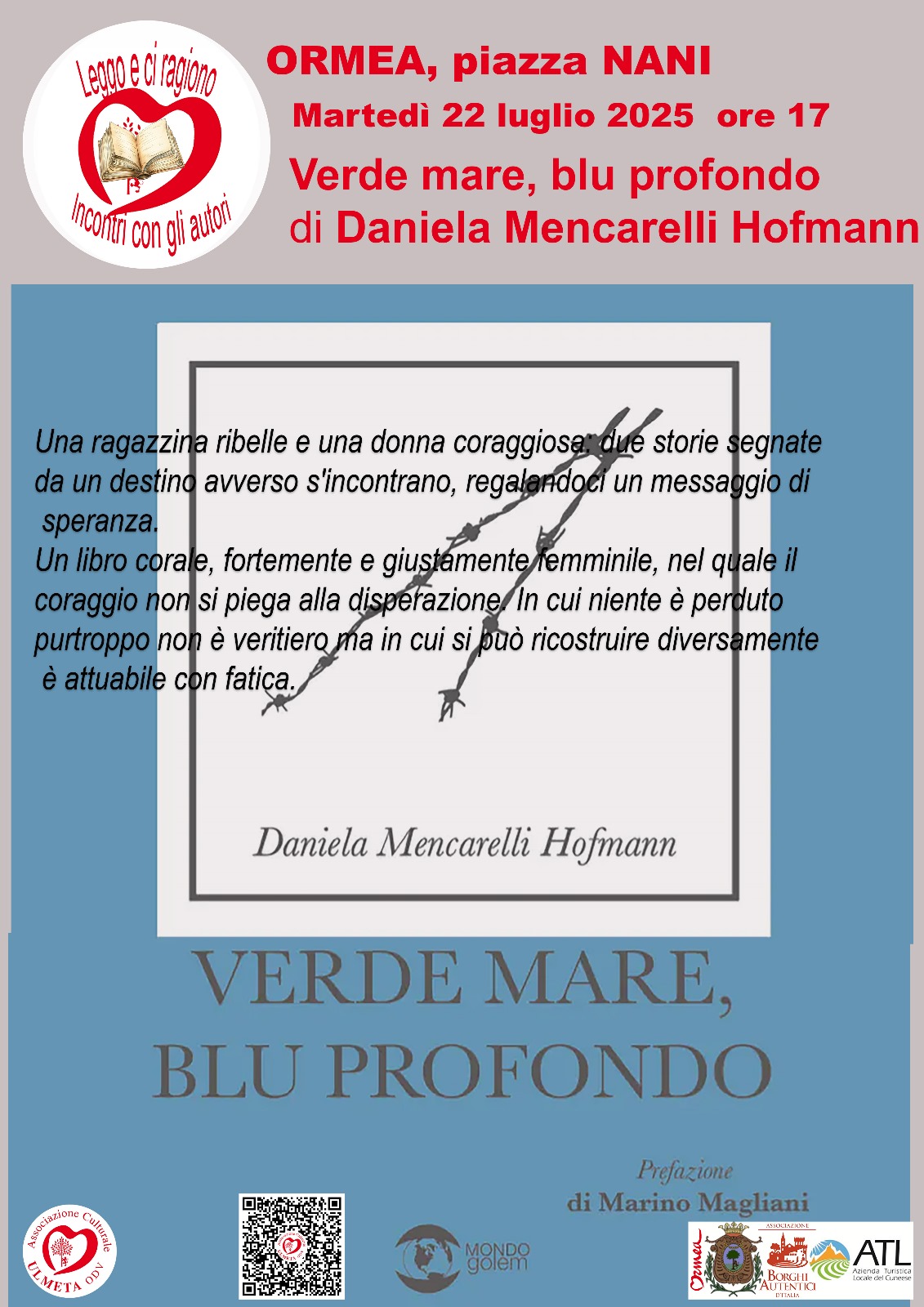 Martedì 22 luglio 2025, ore 17.00 in piazza Nani: nell’ambito della rassegna «Leggo e ci ragiono – Incontri con gli autori» verrà presentato il romanzo «Verde mare, blu profondo» di Daniela Mencarelli Hofmann, con prefazione di Marino Magliani.