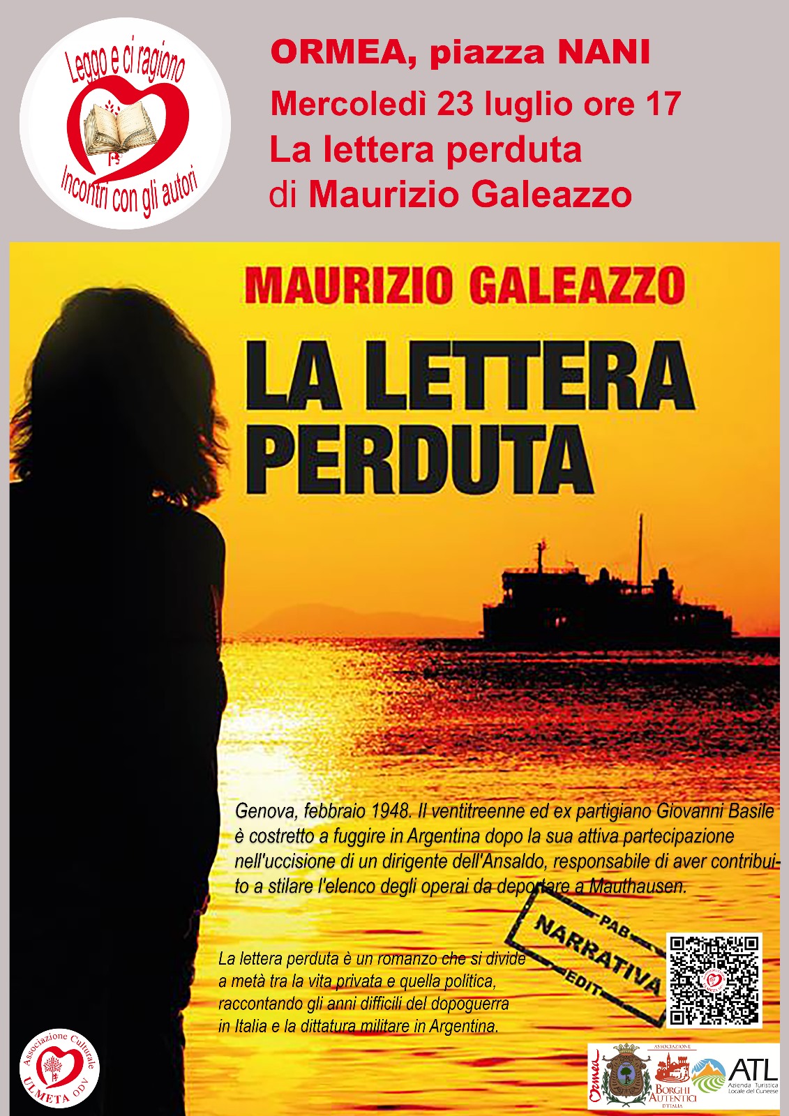 Mercoledì 23 luglio 2025, ore 17, piazza Nani nuovo appuntamento con la rassegna «Leggo e ci ragiono – Incontri con gli autori». Maurizio Galeazzo presenta il romanzo «La lettera perduta», una storia intensa ambientata tra l’Italia del dopoguerra e la dittatura argentina, dove si intrecciano vicende personali e politica.