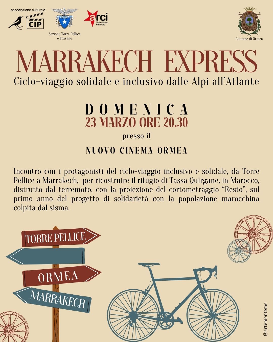 Unisciti a noi per un incontro speciale con i protagonisti di Marrakech Express, il ciclo-viaggio solidale e inclusivo che ha attraversato le strade da Torre Pellice a Marrakech con un obiettivo importante: contribuire alla ricostruzione del rifugio di Tassa Quirigane, in Marocco, distrutto dal terremoto.