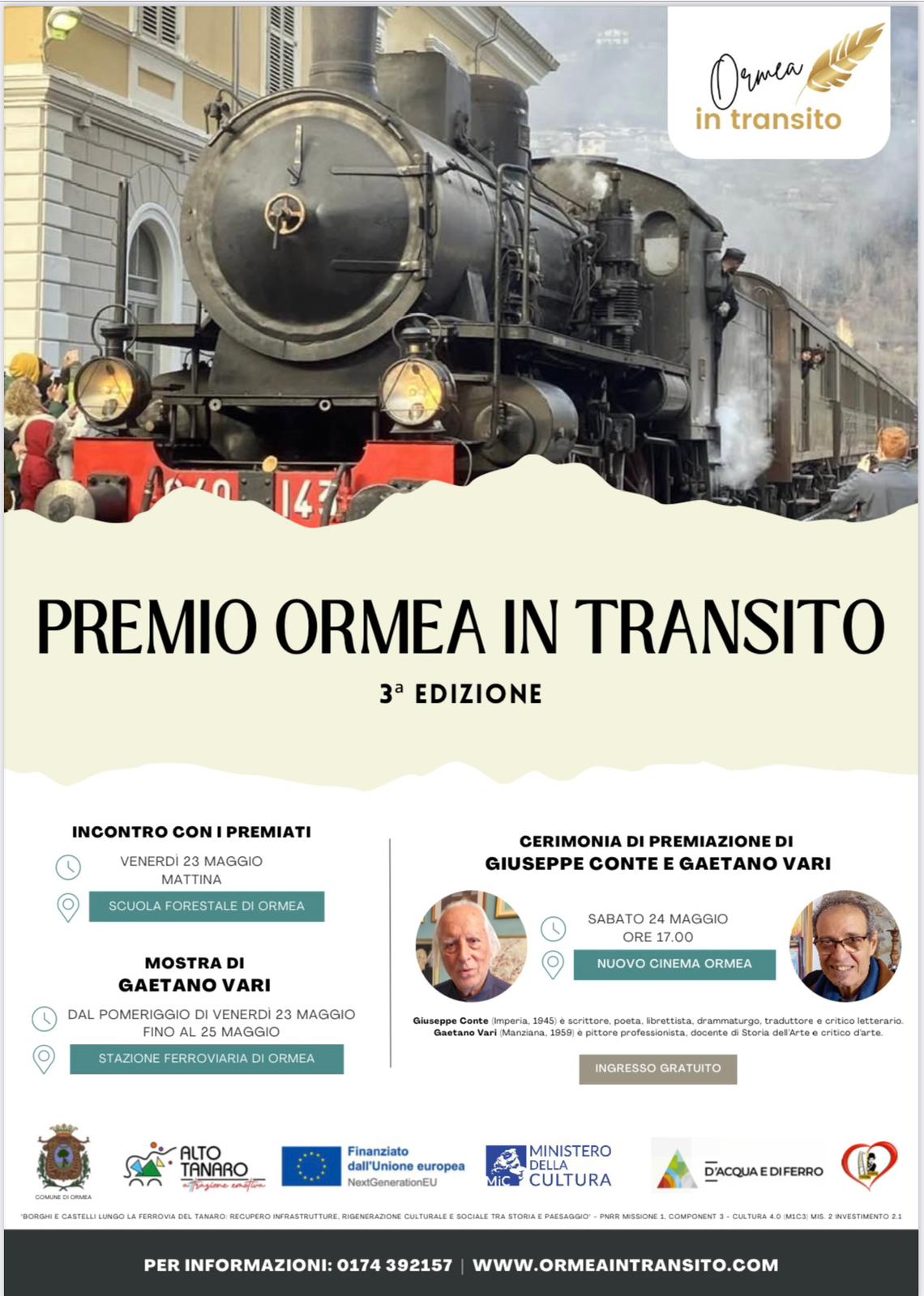 La giornata di premiazione sarà preceduta, il 23 maggio, da un incontro tra Conte e Vari e gli studenti della Scuola Forestale di Ormea e dall'inaugurazione, alle ore 16:00 presso la Stazione Ferroviaria, della mostra di Gaetano Vari, che resterà aperta anche nei giorni successivi. Durante la cerimonia di premiazione, verranno proiettati filmati sulla carriera dei due artisti e l'attore Lello Ceravolo leggerà brani di Giuseppe Conte.