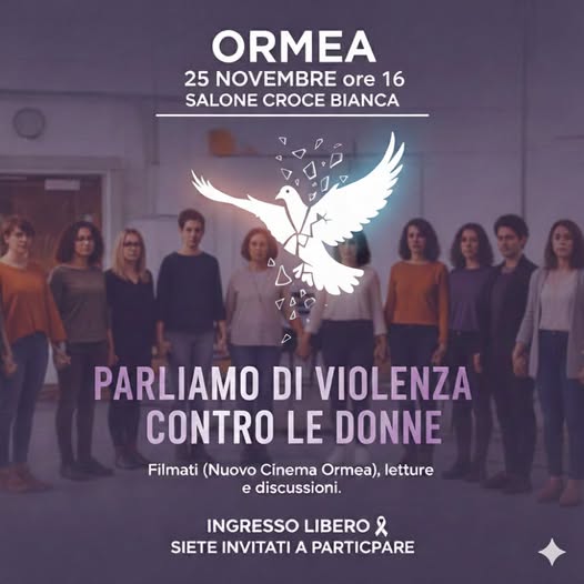 Martedì 25 novembre alle ore 16, presso il Salone della Croce Bianca, si svolgerà un incontro dedicato alla Giornata contro la Violenza sulle Donne, con filmati a cura del Nuovo Cinema Ormea, letture e discussioni.