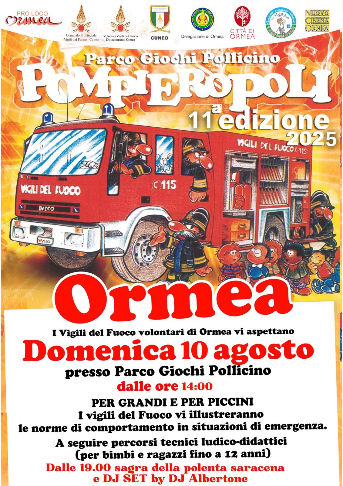 Domenica 10 agosto a partire dalle ore 14:00, al Parco Giochi Pollicino, i Vigili del Fuoco volontari di Ormea vi aspettano per l’11ª edizione di Pompieropoli.