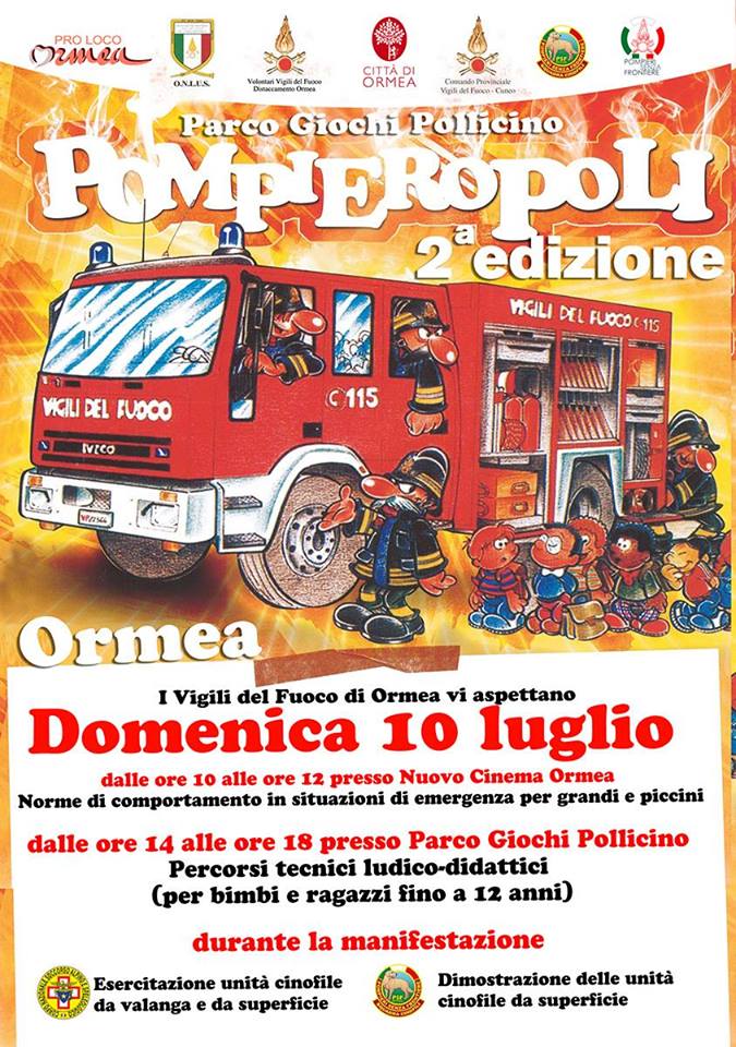 I Vigili del Fuoco di Ormea vi aspettano dalle 10 alle 12 presso il Nuovo Cinema Ormea per seguire norme di comportamento in situazioni di emergenza per grandi e piccini e dalle 14 alle 18 presso il Parco Giochi Pollicino con percorsi tecnici ludico-didattici; durante la manifestazione esercitazione di unità cinofile da valanga e da superficie
