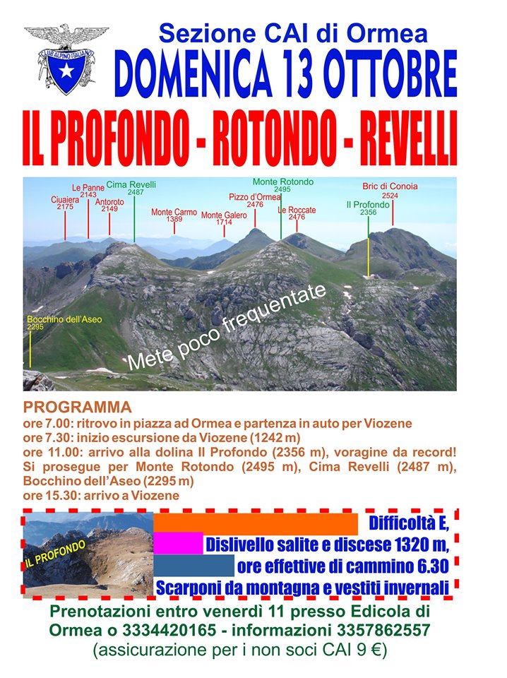 Cammineremo in zone poco frequentate nella zona del Mongioie - Bric di Conoia. Indagheremo la misteriosa dolina Il Profondo, saliremo cime trascurate: Monte Rotondo e Cima Revelli.