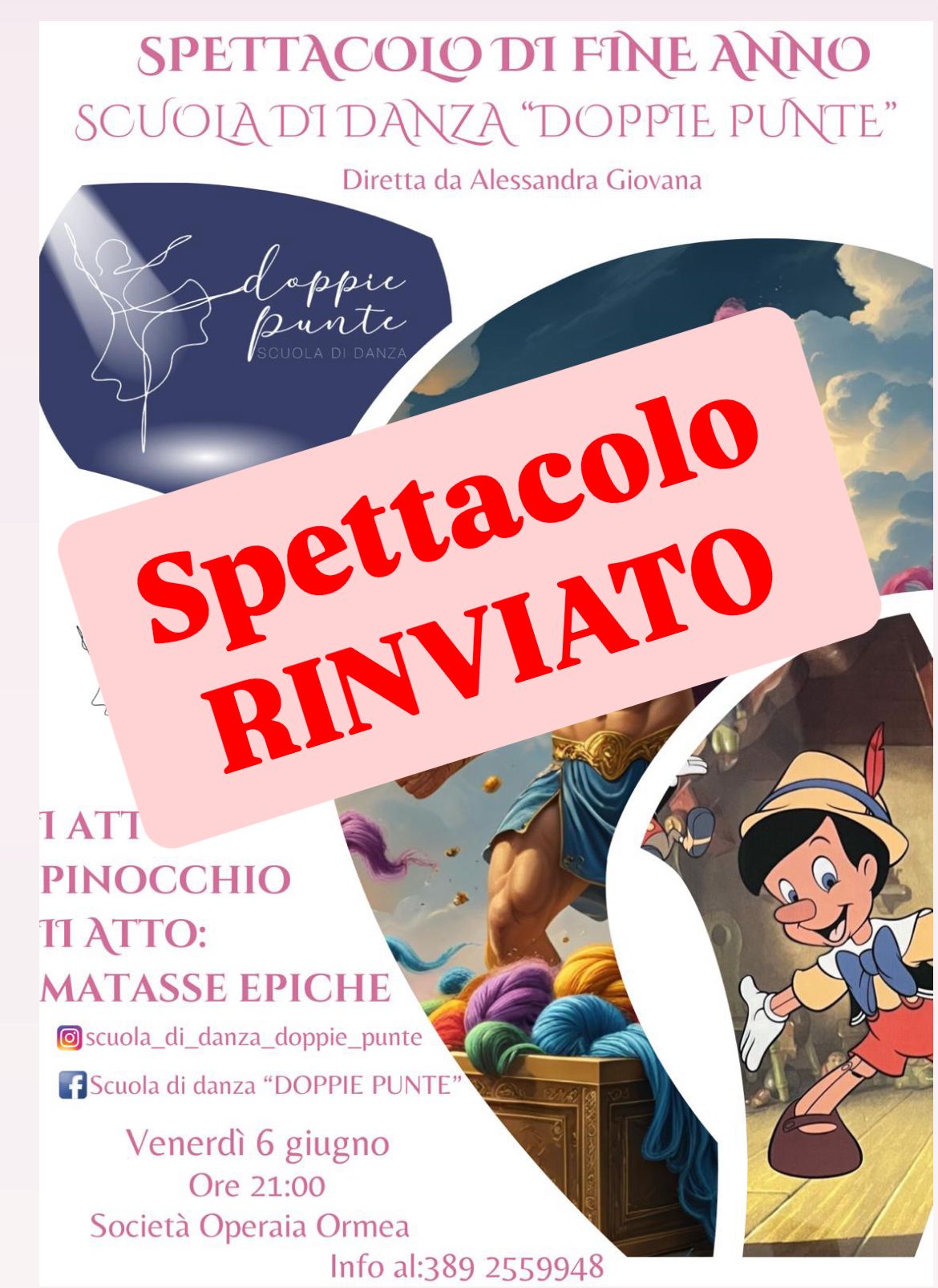 Venerdì 6 giugno alle ore 21.00 nella Sala della Società Operaia la Scuola di Danza "Doppie Punte" diretta da Alessandra Giovana è lieta di presentare lo spettacolo di fine anno.