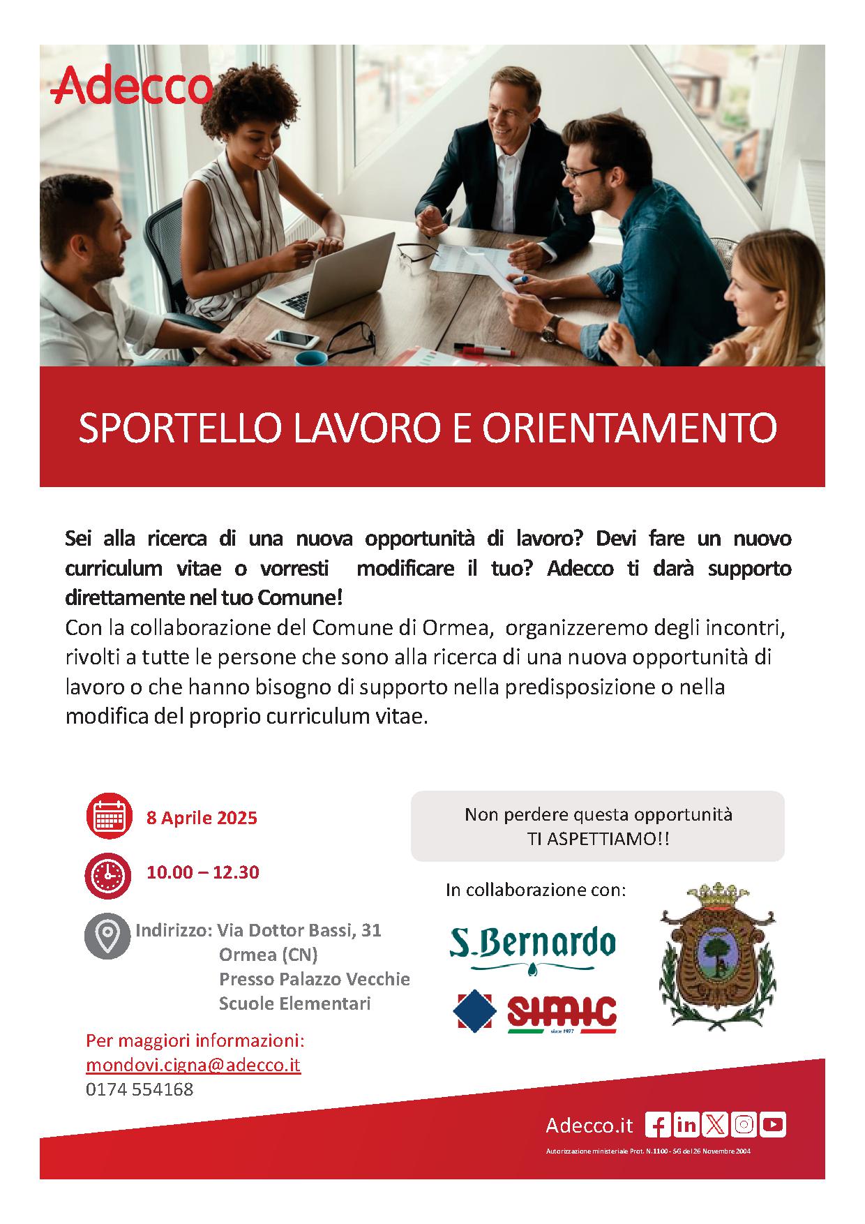 Adecco, in collaborazione con il Comune di Ormea, organizza un incontro dedicato a chi è alla ricerca di lavoro o vuole un supporto nella preparazione del proprio CV. Un’occasione da non perdere per ricevere consigli preziosi e orientamento professionale!