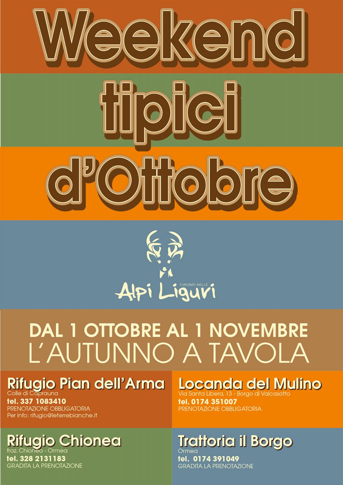 Rifugio Pian dell'Arma di Caprauna, il Rifugio di Chionea, la Trattoria il Borgo di Ormea e la Locanda del Mulino del Borgo di Valcasotto dal 1 ottobre al 1 novembre propongono quattro menù all’insegna del gusto e della qualità utilizzando ingredienti locali poveri ma usati con grande esperienza e fantasia.