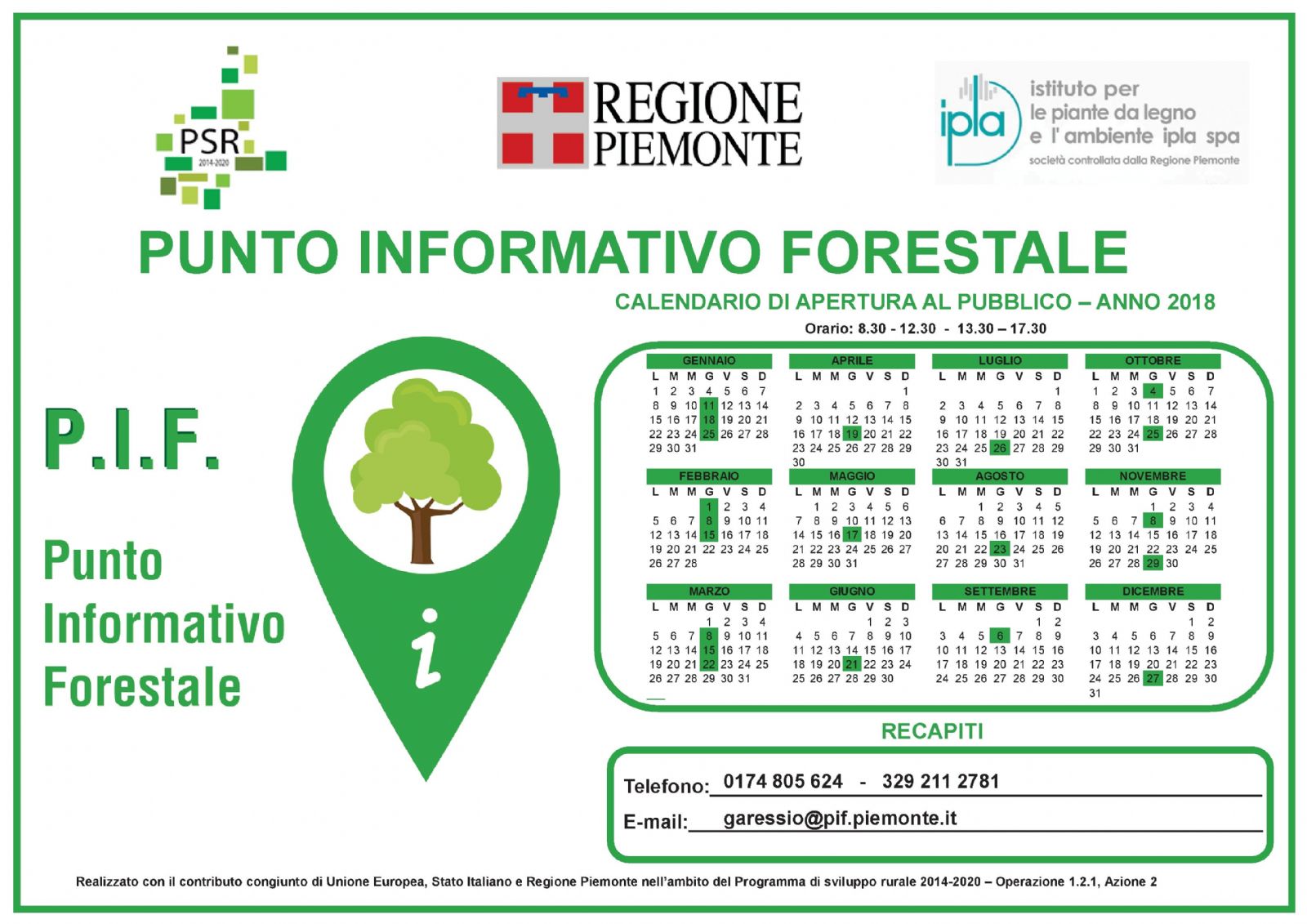 Anche per l'anno 2018 presso la sede comunale di Garessio sarà attivo il Punto Informativo Forestale (PIF), realizzato da IPLA S.p.A con il contributo congiunto di Unione Europea, Stato Italiano e Regione Piemonte nell’ambito del Programma di Sviluppo Rurale 2014-2020.