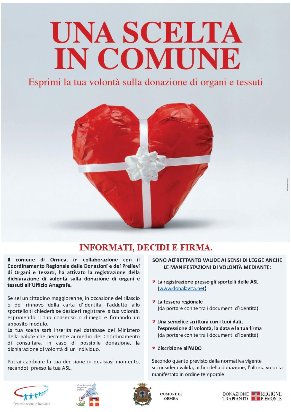 il Comune di Ormea, in collaborazione con il Coordinamento Regionale delle donazioni e dei Prelievi di organi e tessuti (CRP) e il Centro Nazionale Trapianti, dal 01/08/2018 ha attivato la registrazione delle dichiarazioni volontà sulla donazione di organi e tessuti che si svolgerà nel seguente modo:
