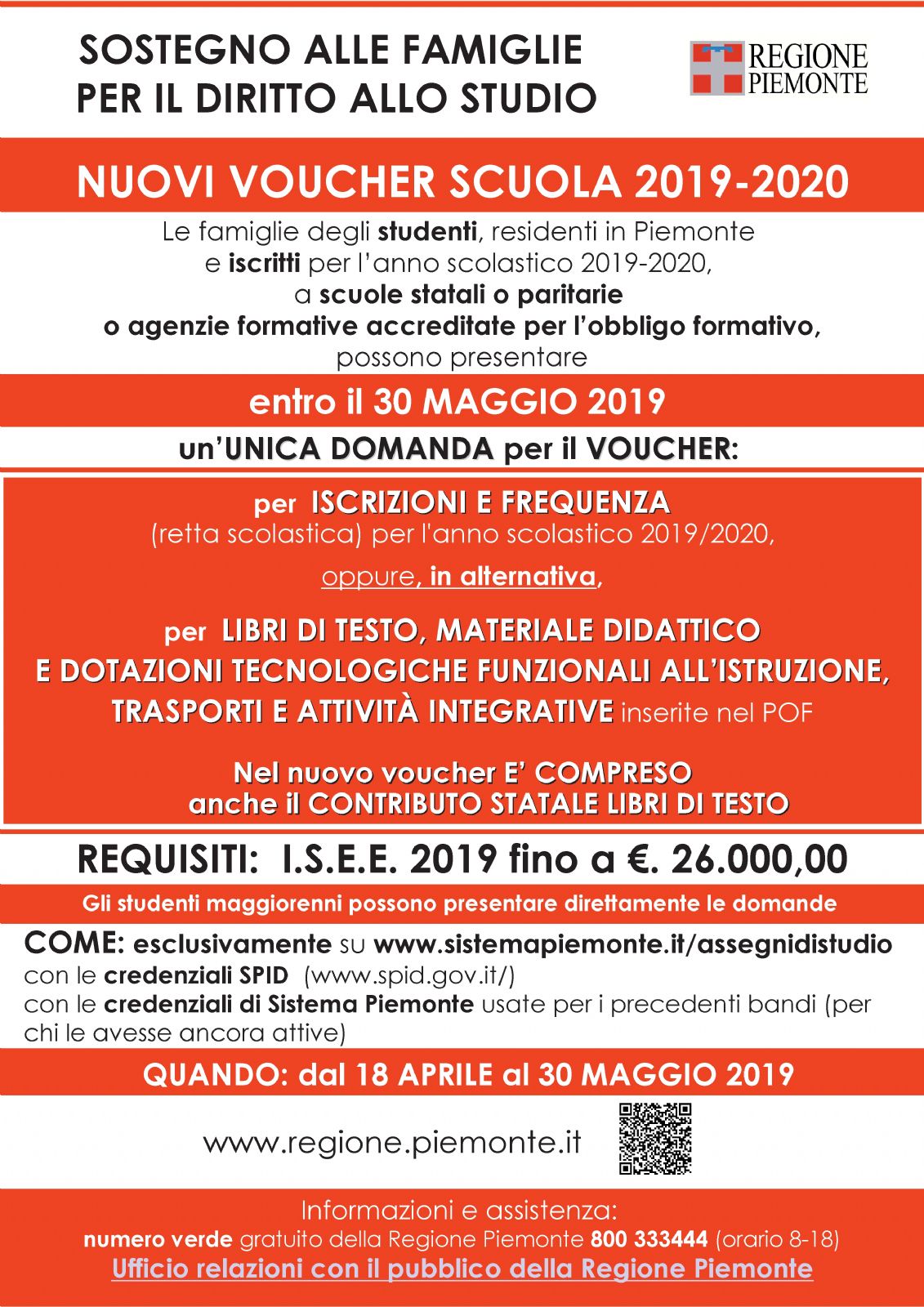Le famiglie degli studenti, residenti in Piemonte e iscritti per l’anno scolastico 2019-2020, a scuole statali o paritarie o agenzie formative accreditate per l’obbligo formativo, possono chiedere ENTRO IL 30 MAGGIO 2019