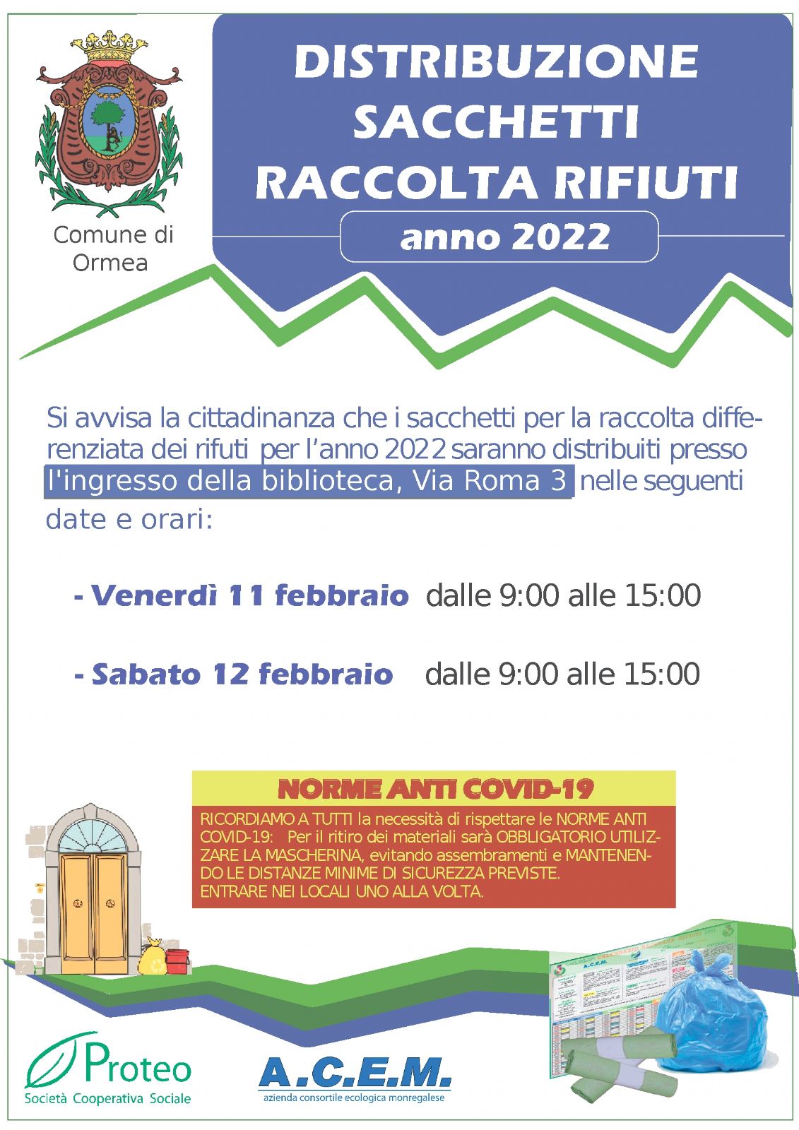 Si avvisa la cittadinanza che i sacchetti per la raccolta differenziata dei rifiuti per l'anno 2022 saranno distribuiti presso l'ingresso della Biblioteca, Via Roma 3, nelle seguenti date: