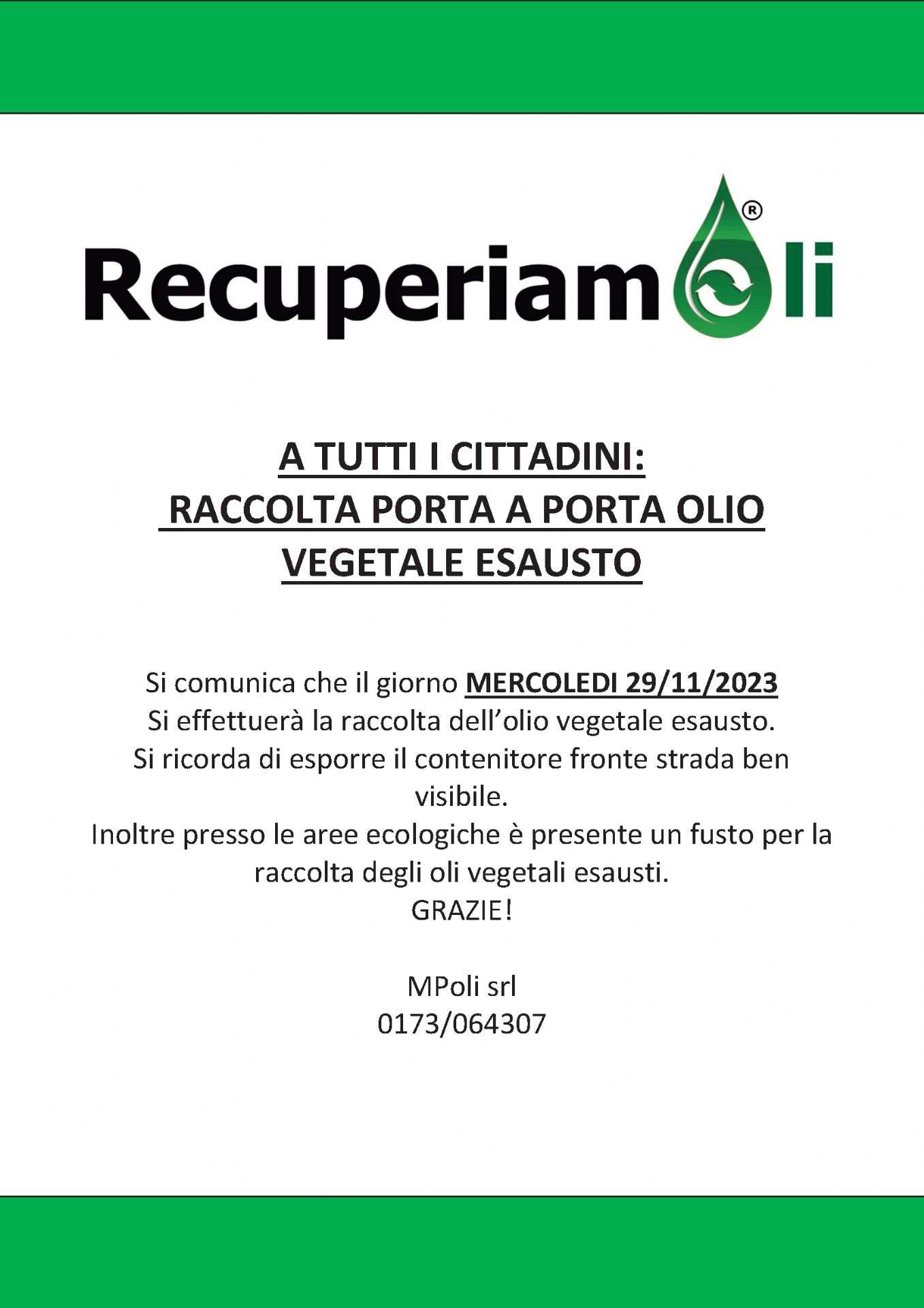 Si comunica che il giorno MERCOLEDI 29/11/2023 si effettuerà la raccolta dell'olio vegetale esausto.