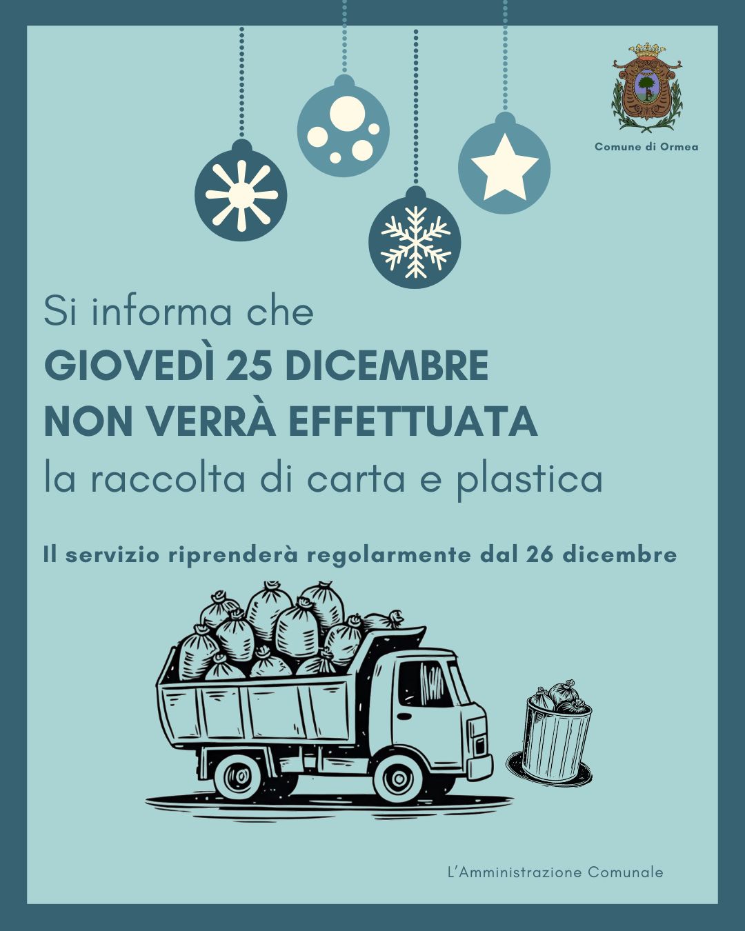 L’Amministrazione Comunale informa che giovedì 25 dicembre il servizio di raccolta di carta e plastica non verrà effettuato.