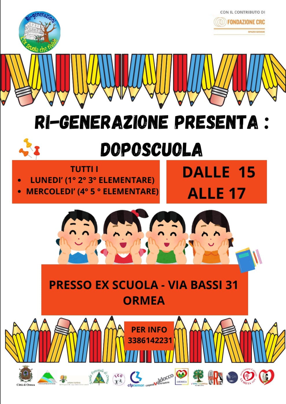Tutti i lunedì e mercoledì si terrà il doposcuola per i bimbi presso le vecchie scuole di Via Bassi.