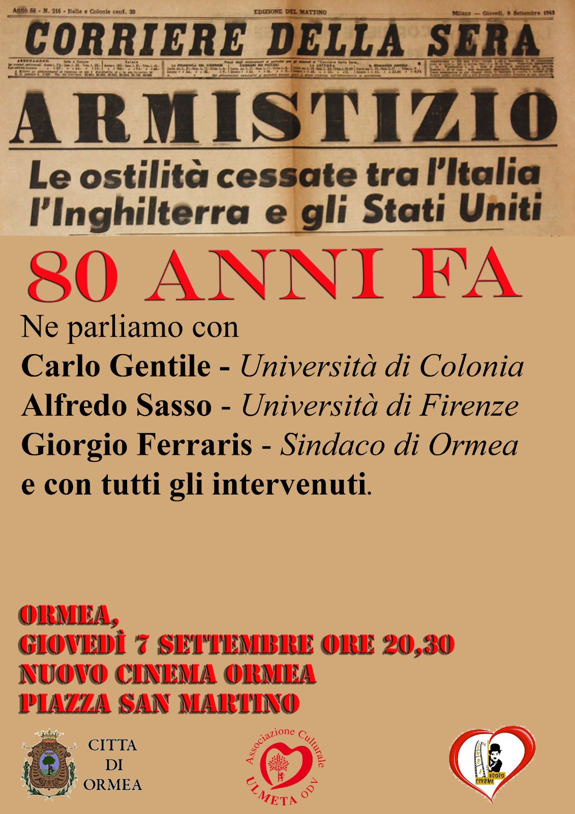 Ore 20.30 presso il Nuovo Cinema Ormea si parlerà dell'Armistizio e delle ostilità cessate tra l'Italia, l'Inghilterra e gli Stati Uniti ottant'anni fa. Se ne parlerà con Carlo Gentile - Università di Colonia, Alfredo Sasso - Università di Firenze e Giorgio Ferraris - Sindaco di Ormea.