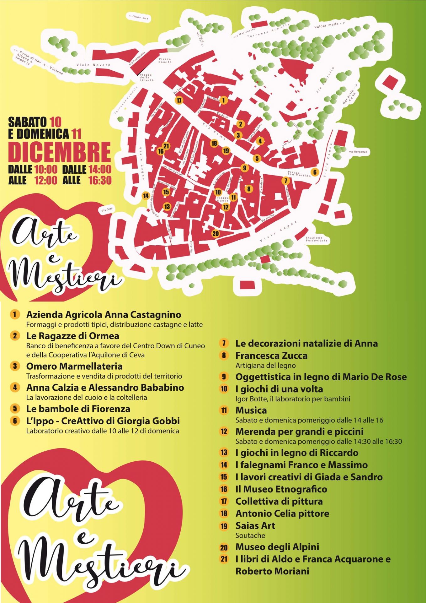 Dalle 10.00 alle 12.00 e dalle 14.00 alle 16.30 nel Centro Storico di Ormea, tra vicoli e corti, la prima edizione di "Arte e Mestieri": prodotti tipici, lavori creativi, mostre, musica e merenda per grandi e piccini.