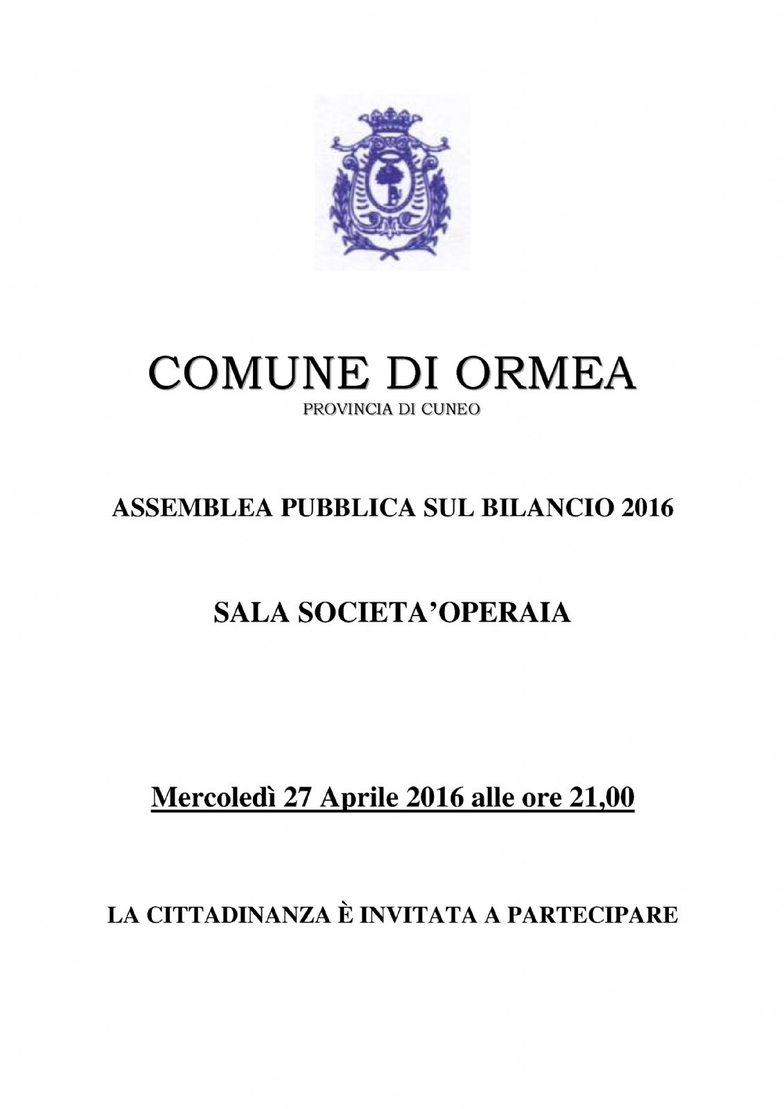 Mercoledi’ 27 aprile 2016 alle ore 21 nella Sala Societa’ Operaia si terra’ l’assemblea pubblica sul bilancio 2016 del Comune di Ormea.