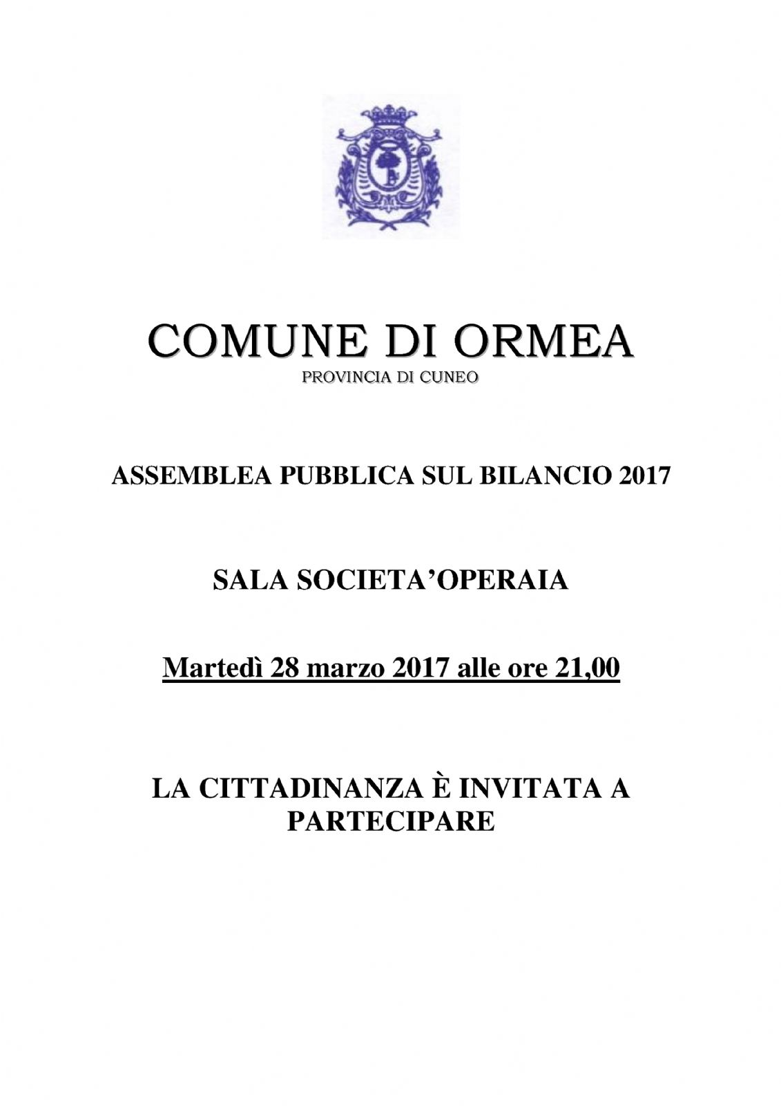 Martedi’ 28 marzo 2017 alle ore 21 nella Sala Societa’ Operaia si terra’ l’assemblea pubblica sul bilancio 2017 del Comune di Ormea.