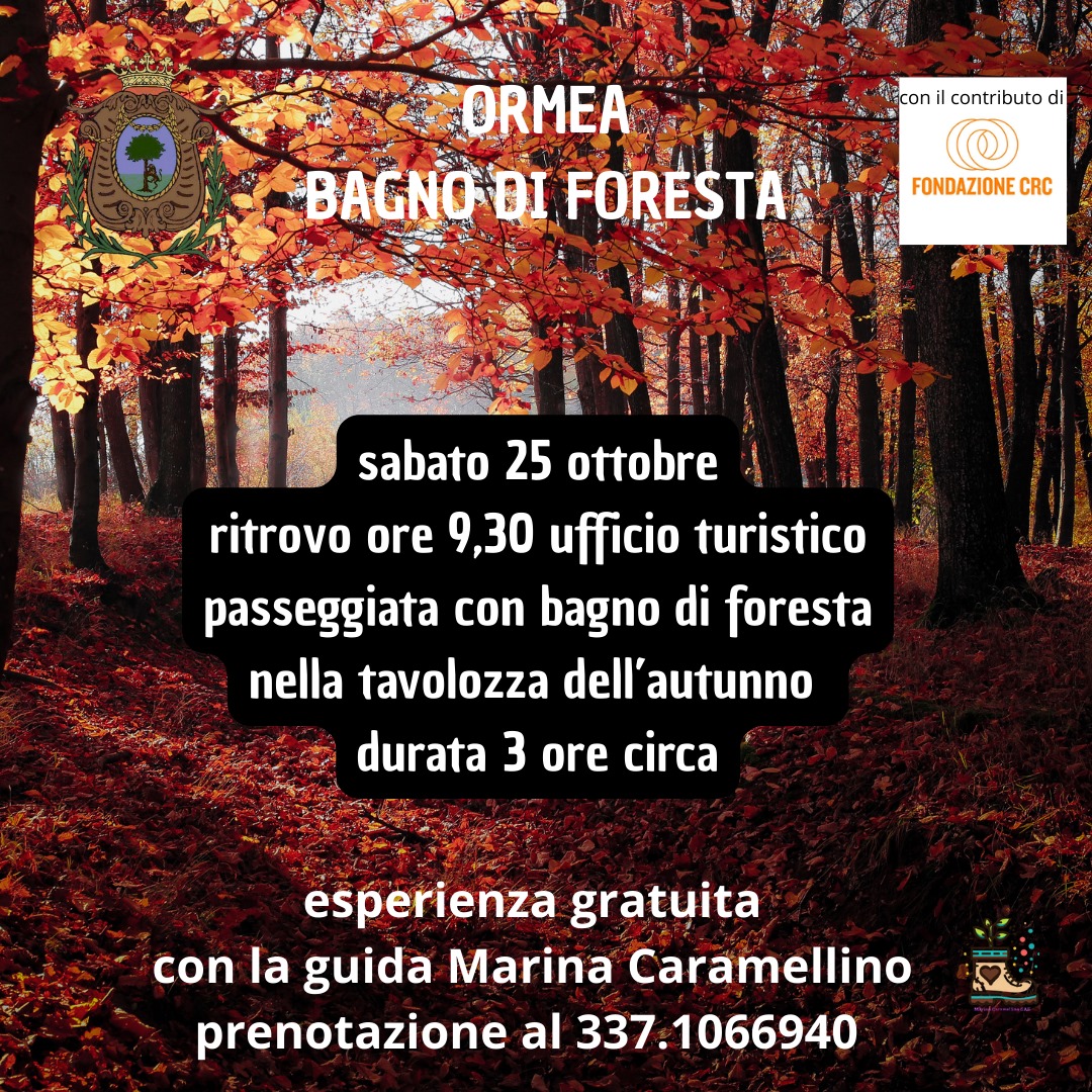 Sabato 25 ottobre ad Ormea si svolge un appuntamento dedicato al Bagno di Foresta, un'esperienza immersiva nella natura all'insegna del respiro, della meditazione e della consapevolezza: un'occasione per rallentare e riconnettersi con la natura.