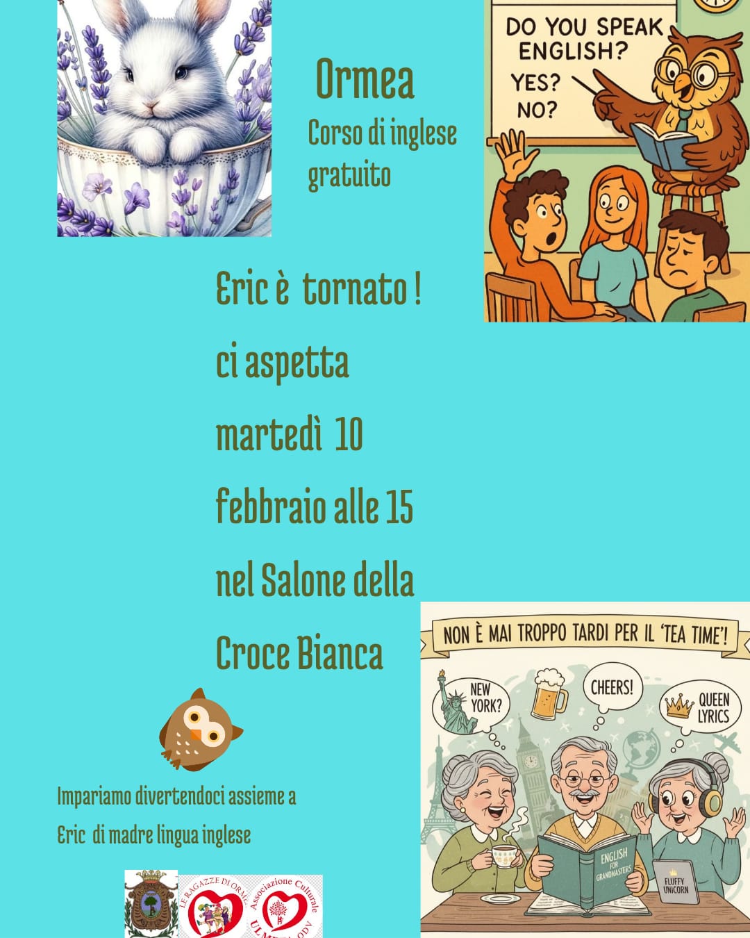 Martedì 10 febbario, a partire dalle ore 15, tornano le lezioni gratuite del corso d'inglese con Eric, madrelingua inglese, nella Sala della Croce Bianca.