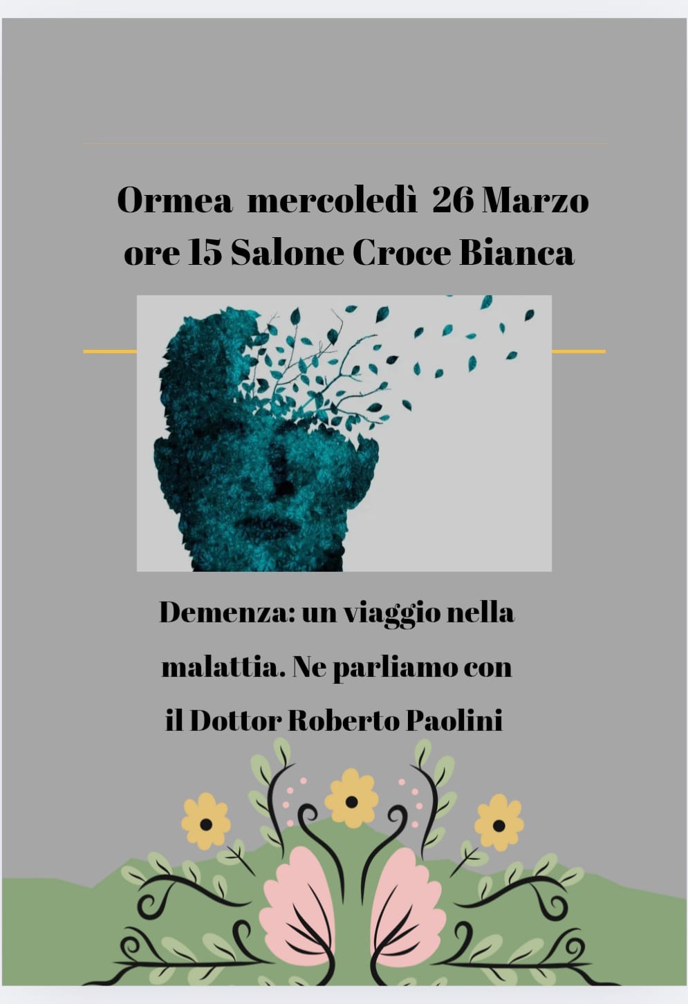 Mercoledì 26 marzo alle ore 15:00, presso il Salone Croce Bianca di Ormea, si terrà un incontro dedicato alla comprensione della demenza, una malattia che colpisce sempre più persone e le loro famiglie.