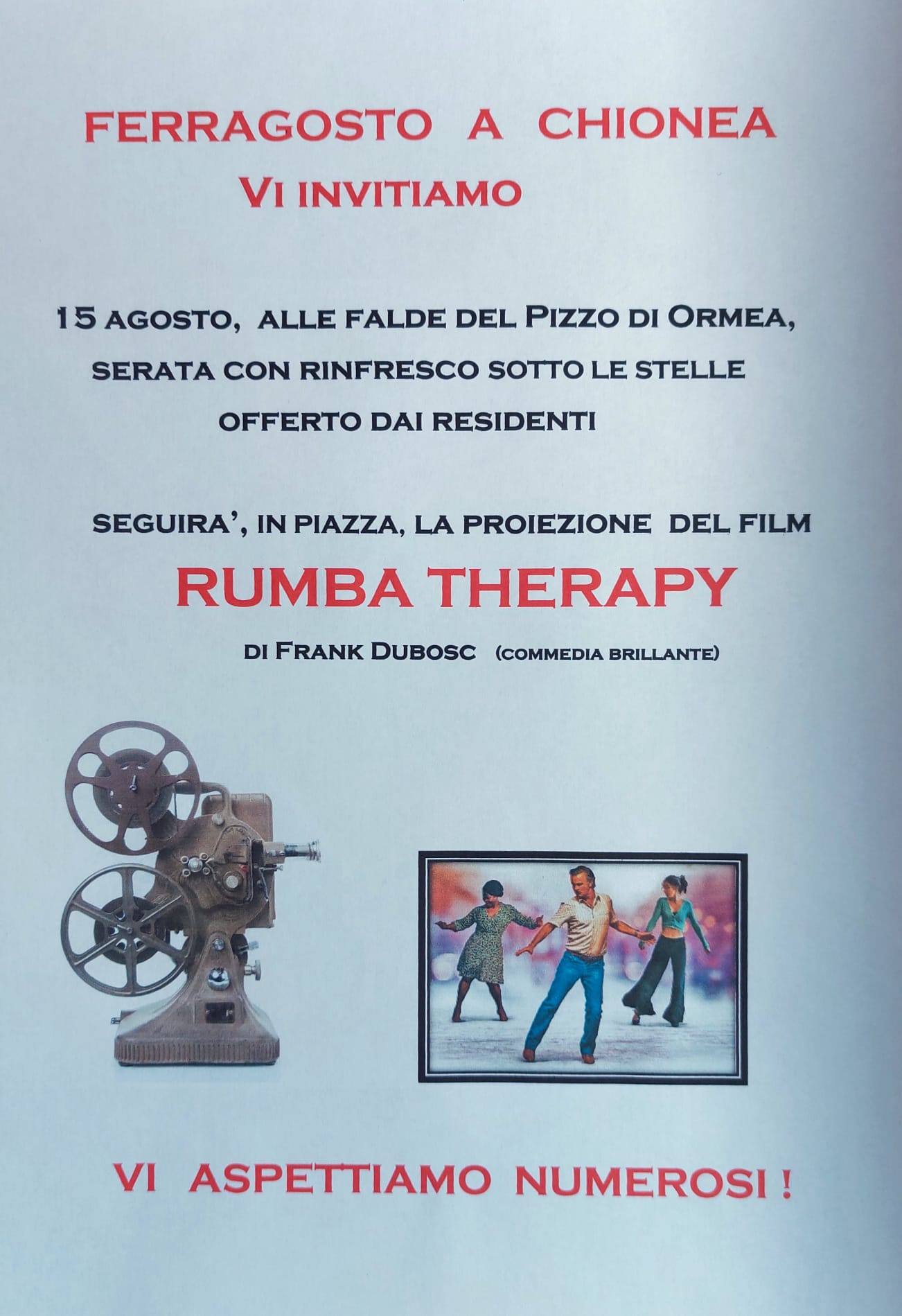 Serata con rinfresco offerto dai residenti, seguirà nella piazzetta della chiesa la proiezione del film "Rumba Therapy" di Frank Dubosc (commedia brillante).
