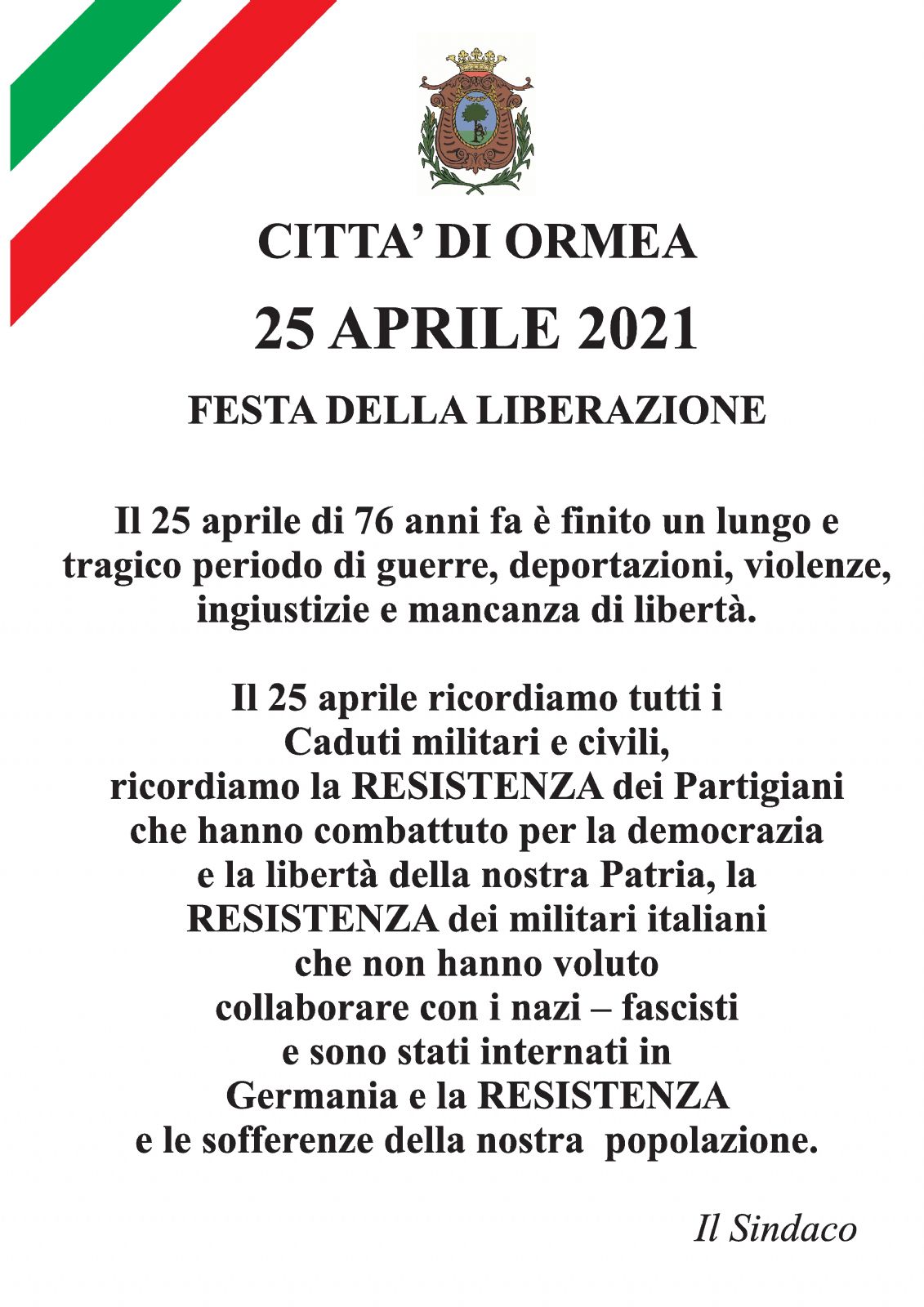 Il 25 aprile ricordiamo tutti i Caduti Militari e Civili, ricordiamo la RESISTENZA dei Partigiani che hanno combattuto per la democrazia e la libertà della nostra Patria, la RESISTENZA dei militari italiani che non hanno voluto collaborare con i nazi-fascisti e sono stati internati in Germania e la RESISTENZA e le sofferenze della nostra popolazione.