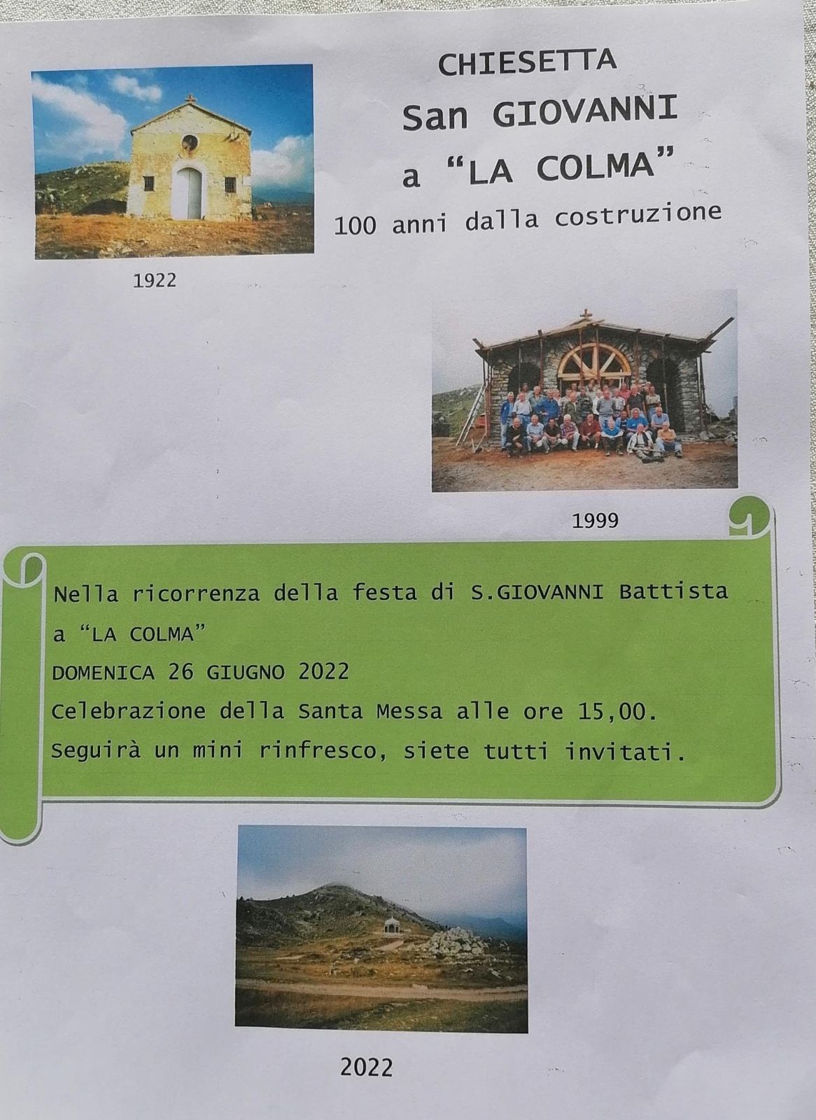 Nella ricorrenza del centenario della Chiesetta di San Giovanni alla Colma, celebrazione della Santa Messa alle ore 15.00, seguirà un mini rinfresco con prodotti tipici locali.