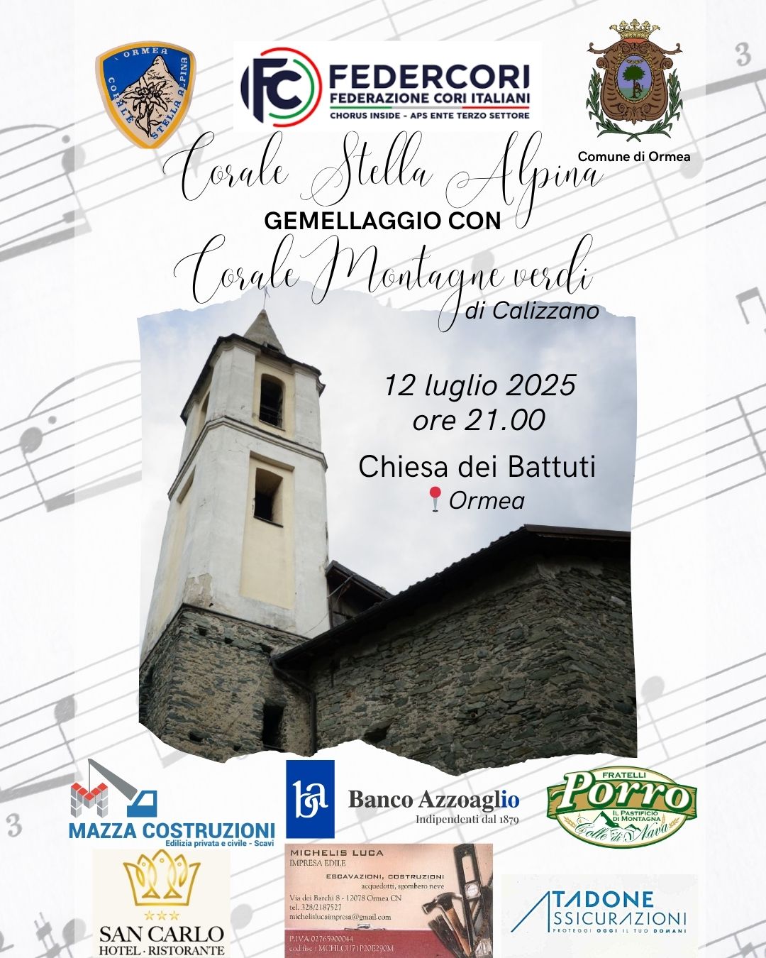 Il prossimo 12 luglio 2025, la città di Ormea ospiterà il gemellaggio tra la Corale “Stella Alpina” di Ormea e la Corale “Montagne Verdi” di Calizzano.