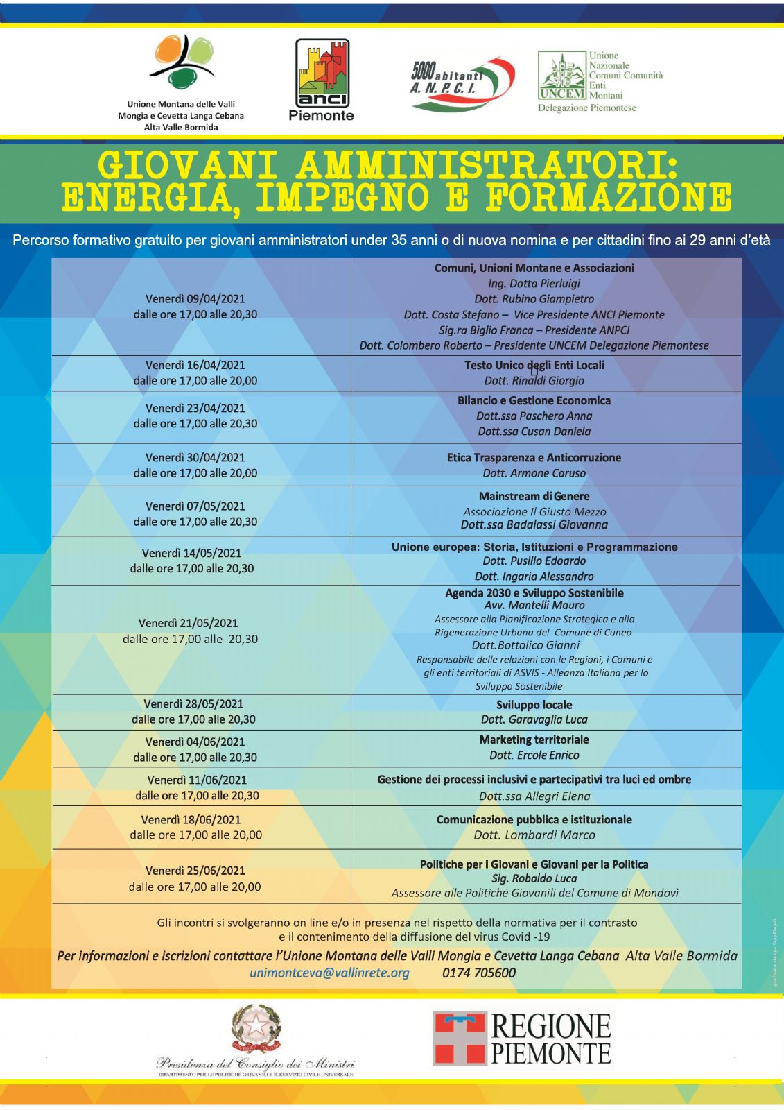 Si informa che l’Unione Montana, in partnership con i Comuni membri, ANCI Piemonte, ANPCI e UNCEM Delegazione piemontese, consapevole dell’importanza dell’apporto di nuove energie alla vita politica, ha presentato candidatura al bando della Regione Piemonte “Partecipazione dei giovani alla vita sociale e politica dei territori”, in attuazione dell’atto di indirizzo di cui alla D.G.R. n. 42-8951 del 16/05/2019, ottenendo un contributo per la realizzazione del progetto “GIOVANI AMMINISTRATORI: ENERGIA, IMPEGNO E FORMAZIONE”.