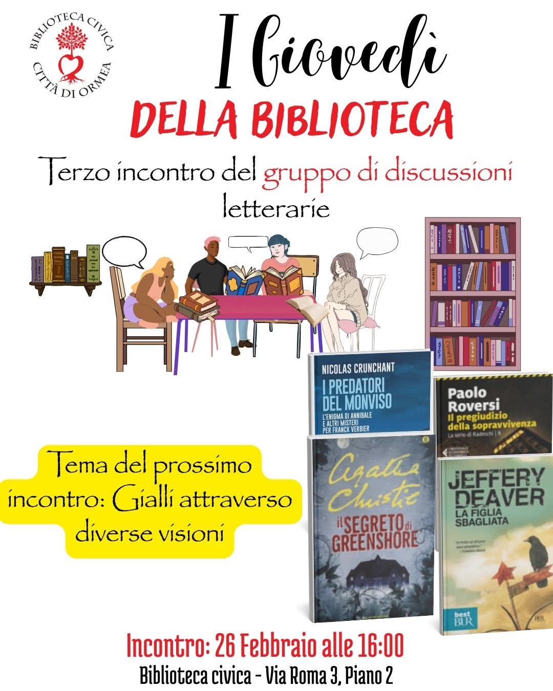 Giovedì 26 febbraio dalle ore 16.00, presso la Biblioteca Civica di Ormea, si svolgerà il terzo incontro de "I Giovedì della Biblioteca", il tema scelto per l'occasione è "Gialli attraverso diverse visioni".