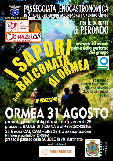 Torna anche quest’anno uno degli appuntamenti più attesi dell’estate ormeasca: la passeggiata enogastronomica “I Sapori della Balconata di Ormea”, giunta alla sua 18ª edizione.