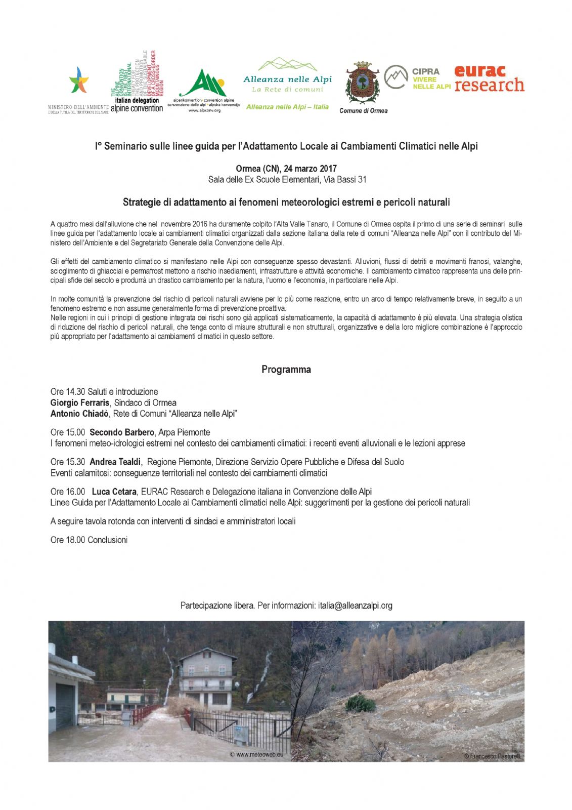 A quattro mesi dall’alluvione che nel novembre 2016 ha duramente colpito l’Alta Valle Tanaro, il Comune di Ormea ospita il primo di una serie di seminari sulle linee guida per l’adattamento locale ai cambiamenti climatici organizzati dalla sezione italiana della rete di comuni “Alleanza nelle Alpi” con il contributo del Ministero dell’Ambiente e del Segretariato Generale della Convenzione delle Alpi.