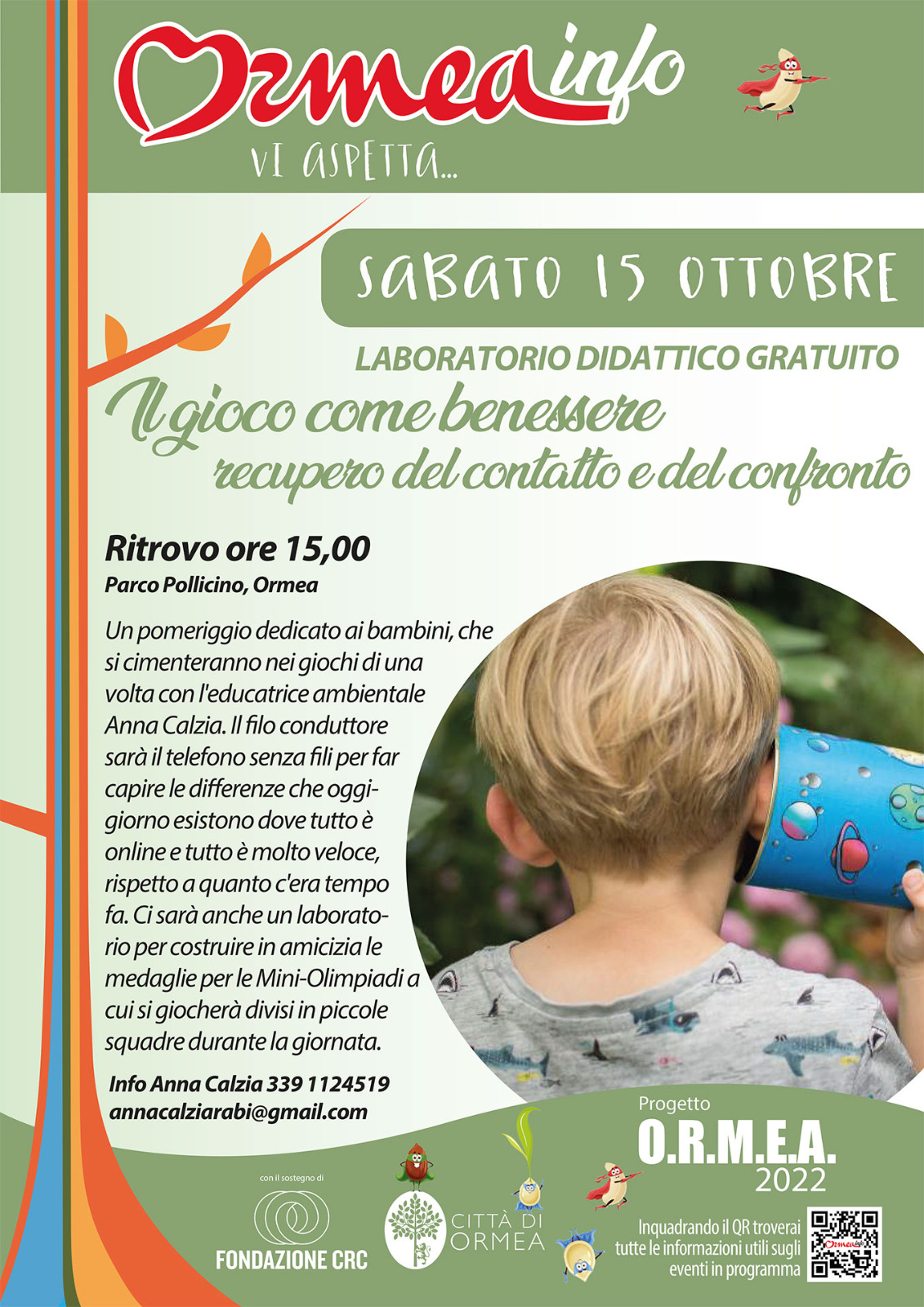 Un pomeriggio dedicato ai bambini che si cimenteranno nei giochi di una volta con l'educatrice ambientale Anna Calzia. Il filo conduttore sarà il telefono senza fili per far capire le differenze che esistono oggi dove tutto è online e tutto è molto veloce, rispetto a quanto c'era tempo fa. Ci sarà anche un laboratorio per costruire in amicizia le medaglie per le Mini-Olimpiadi a cui si giocherà divisi in piccole squadre durante la giornata.