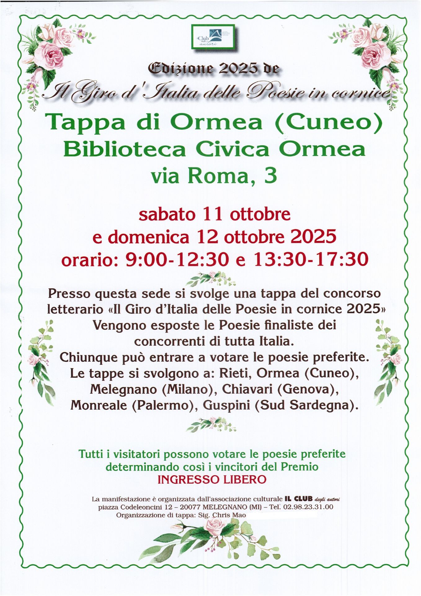 Presso la Biblioteca Civica di Ormea dalle ore 9.00 alle 12.30 e dalle 13.30 alle 17.30 si svolge una tappa del concorso letterario "Il Giro d'Italia delle Poesie in cornice 2025". Vengono esposte le poesie finaliste dei concorrenti di tutta Italia. Chiunque può votare le poesie preferite.