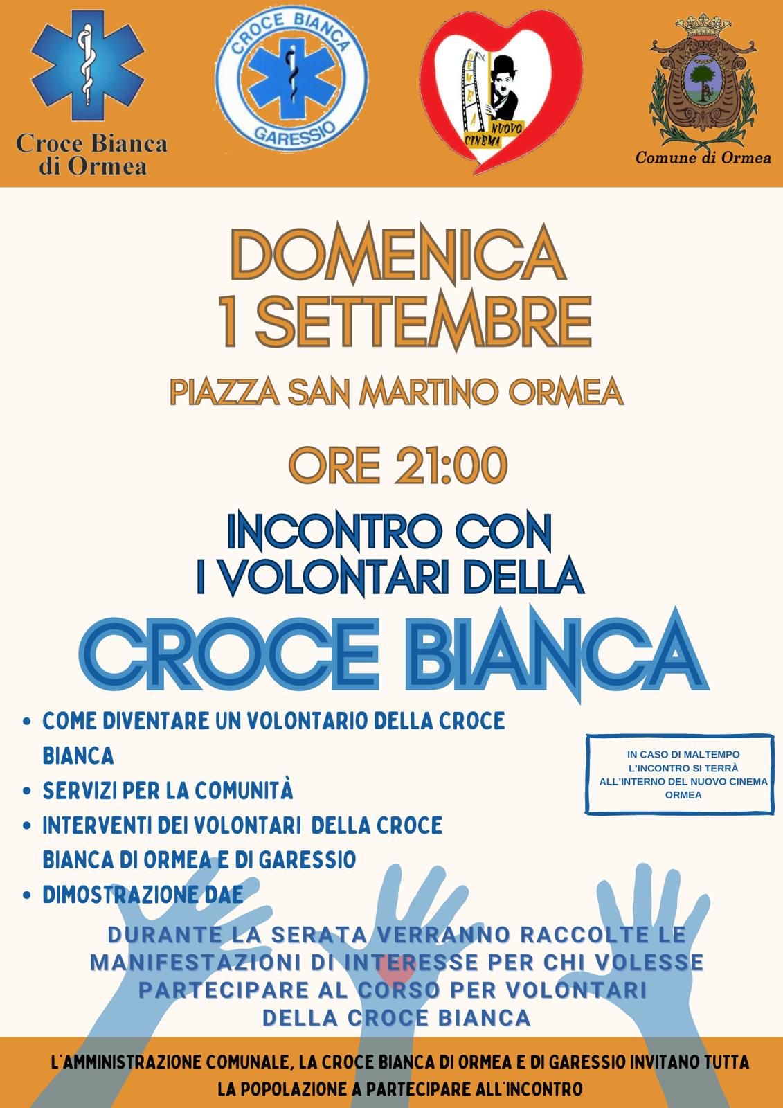 Alle ore 21 presso Piazza San Martino a Ormea si terrà l'incontro con i volontari della Croce Bianca.